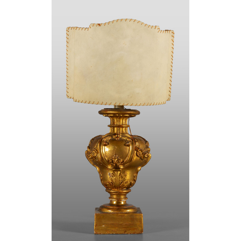 Vaso in legno intagliato e dorato adattato a lampada sec.XVIII