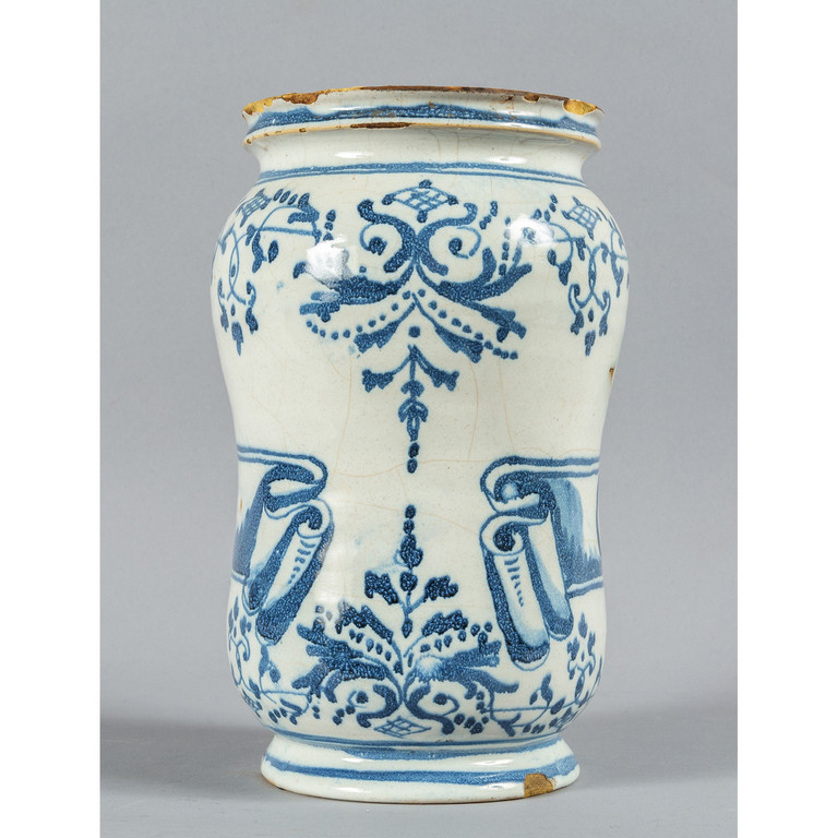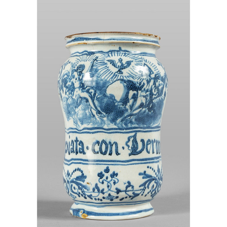 Albarello in ceramica decorazione bianca e blu con raffigurazioni religiose scritta medicinale 'Oppiata con verm' marca Lanterna Savona sec.XVIII