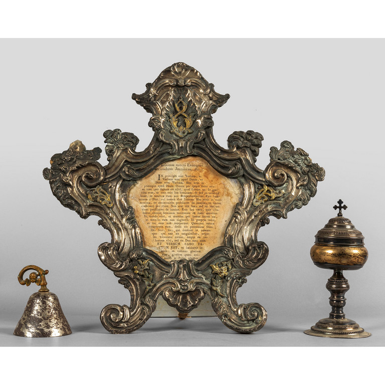 Pisside in argento punzone mauriziano (h.cm.17) campanello in metallo argentato e cantagloria in argento del sec.XVIII (cm.38x40)