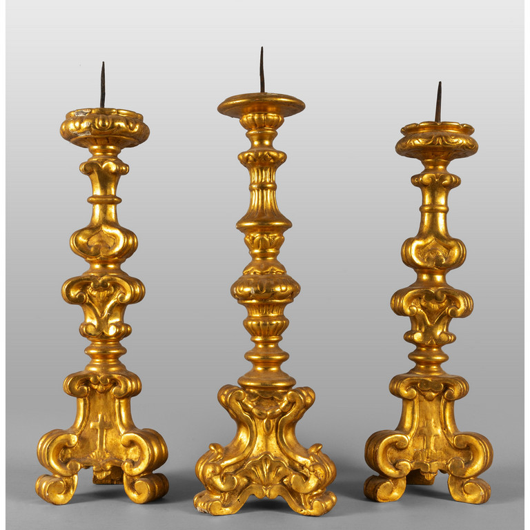 Tre candelieri in legno intagliato e dorato sec.XVIII