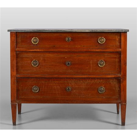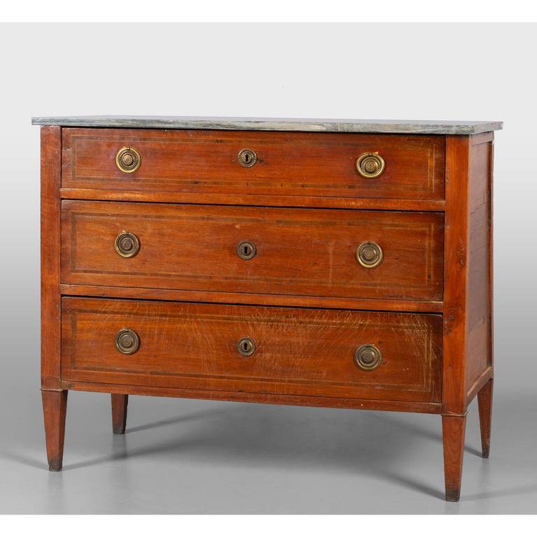 Comò Luigi XVI in massello intarsiato con filetti piano in marmo sec.XVIII