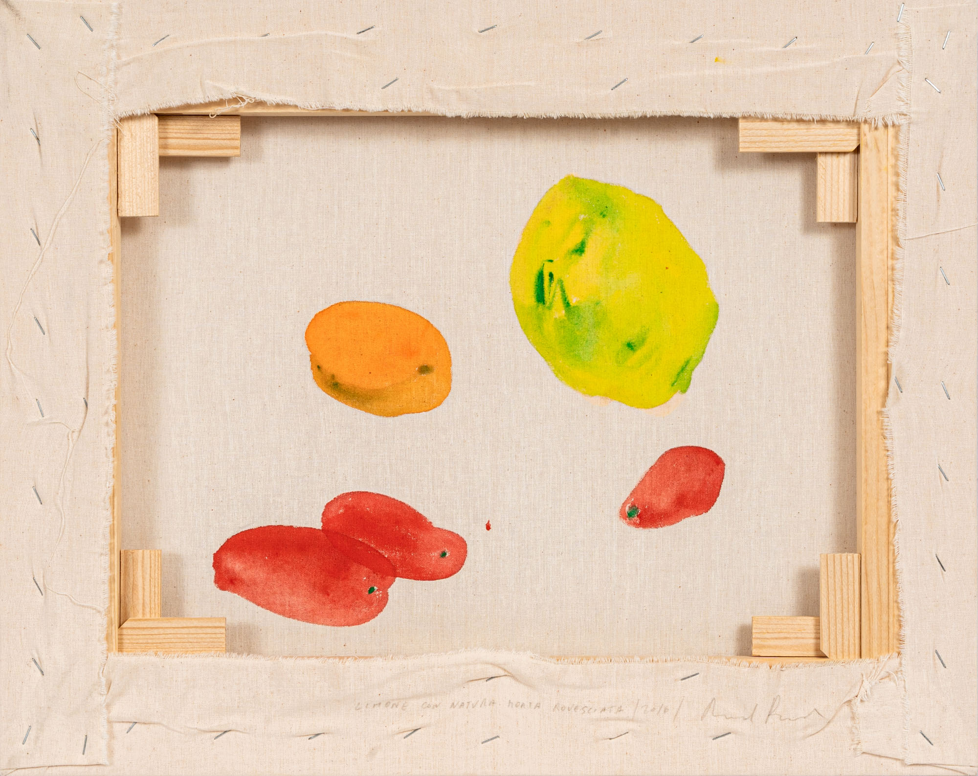 RICCARDO BARUZZI(1976)Limone con natura morta rovesciata2016Tempera e grafite su cotone appartenente alla serie 'Natura morta rovesciata'40 x 50 cmFirma, data e titolo al retroPROVENIENZA:Collezione privata, Milano