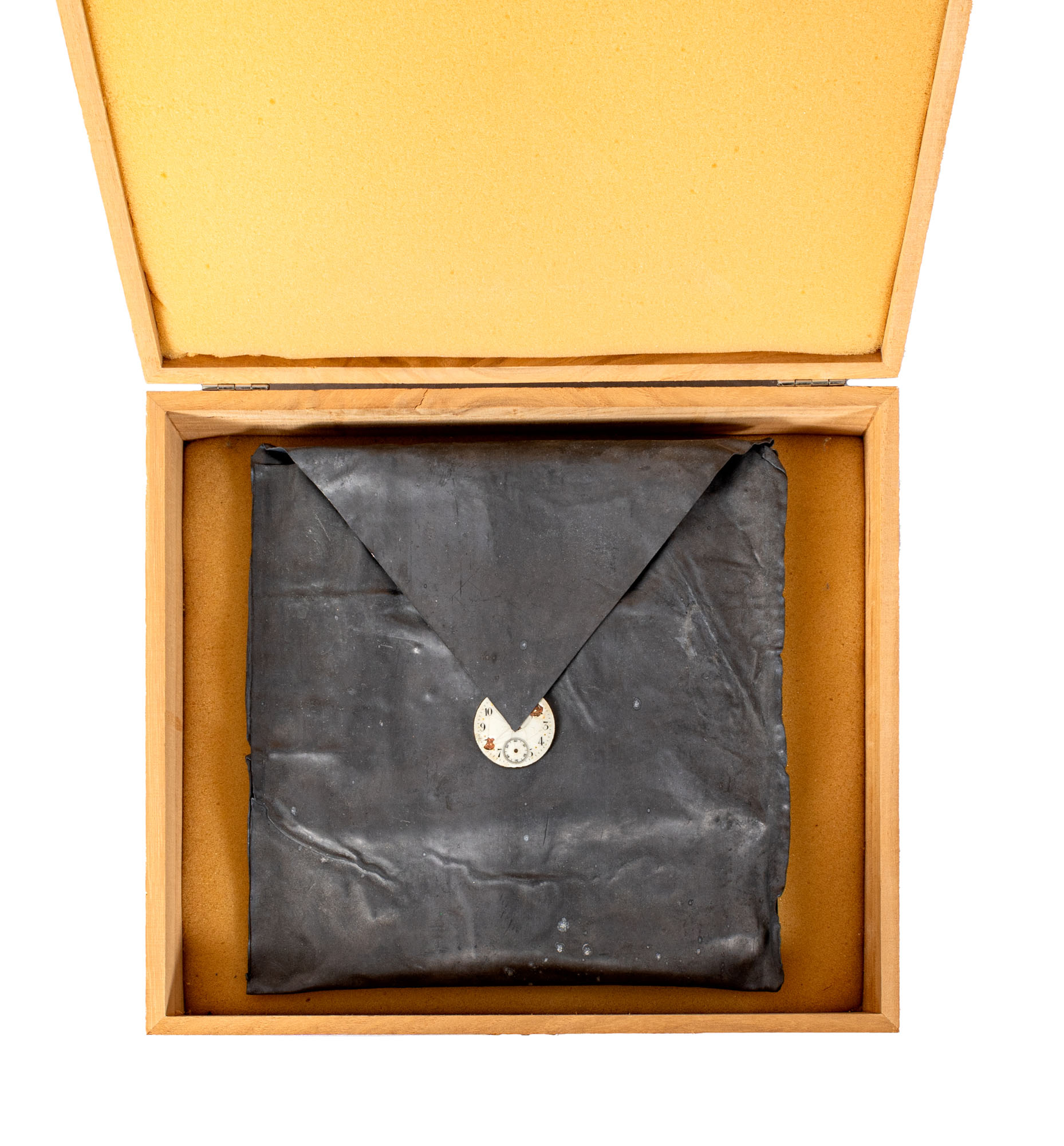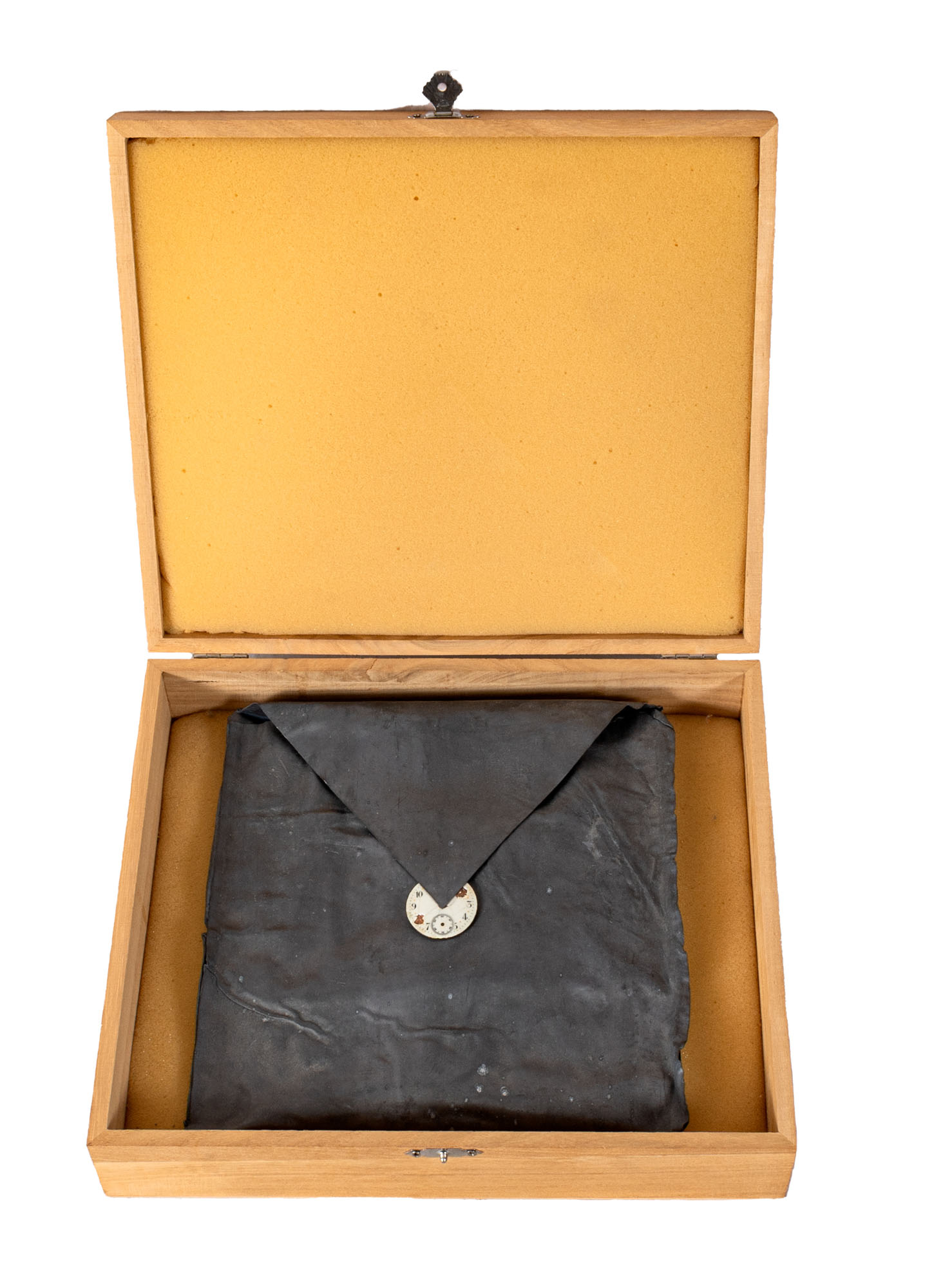 Scultura in piombo e quadrante di orologio entro scatola in legno, esemplare unico