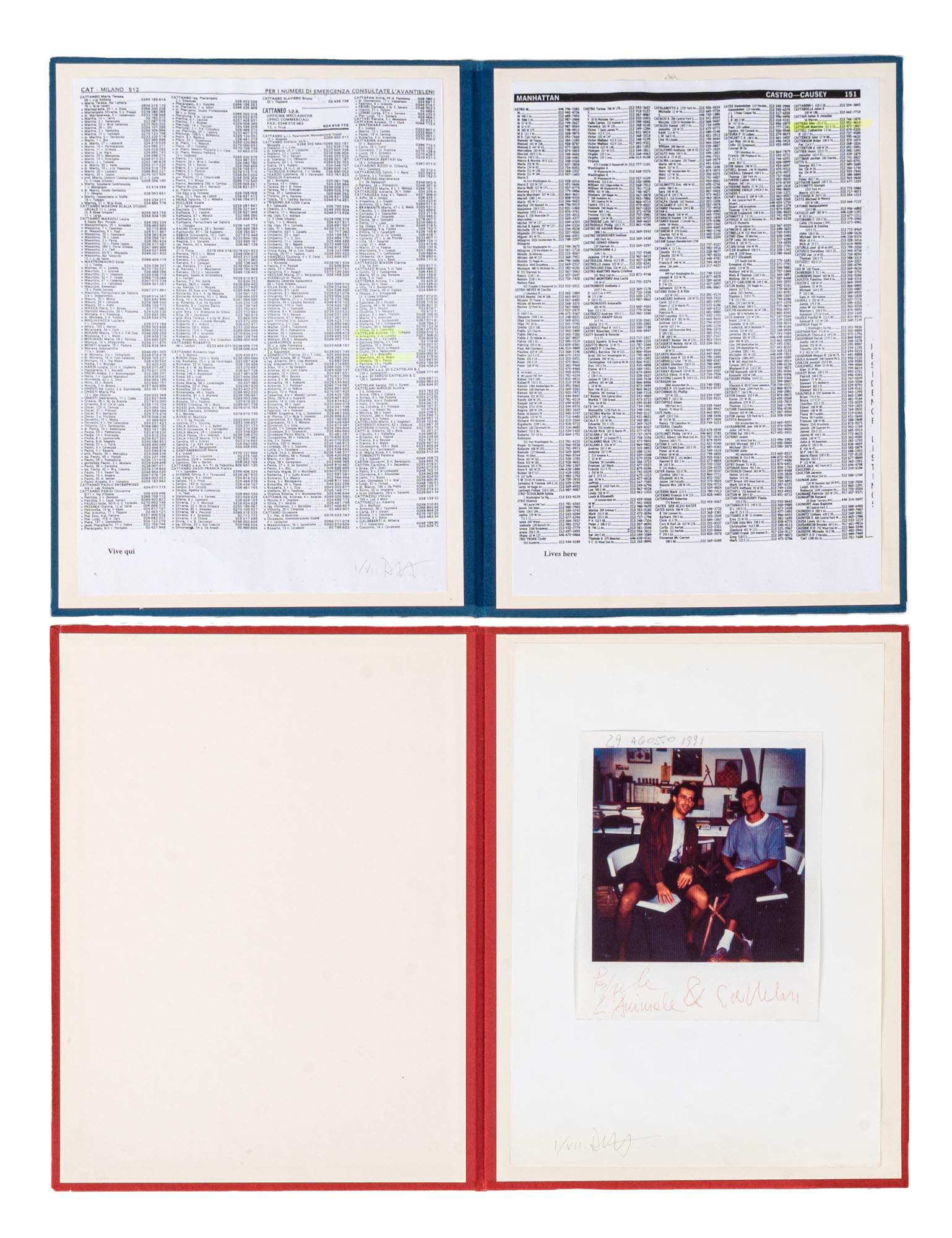 Due cartelle contenenti due pagine di elenchi telefonici (Milano/Manatthan) e fotocopia raffigurante Maurizio Cattelan e Pasquale Martini, es I/VII, Exempla Danilo Montanari Editore, Ravenna