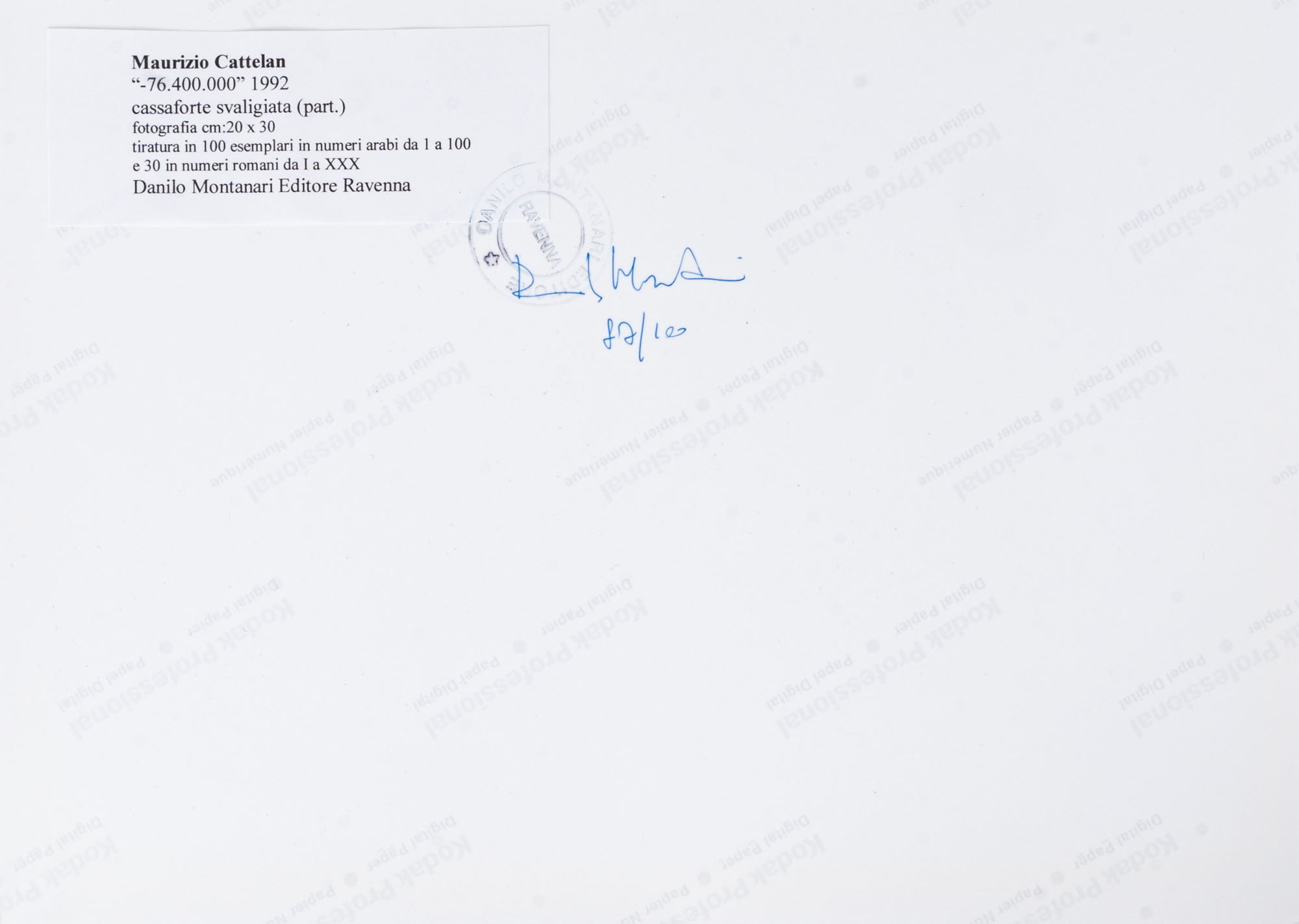 MAURIZIO CATTELAN(1960)-76.400.000 - cassaforte svaligiata (part.)1992Cartella contenente una stampa cibachrome, ed. 87/100 su una tiratura complessiva di 100 esemplari in numeri arabi e 30 in numeri romani, Danilo Montanari Editore, RavennaDimensioni della cartella: 32 x 22 cmDimensioni della stampa cibachrome: 20 x 27,8 cmTimbro e firma Danilo Montanari Editore e numerazione al retro della stampa cibachromePROVENIENZA:Collezione privata, Milano
