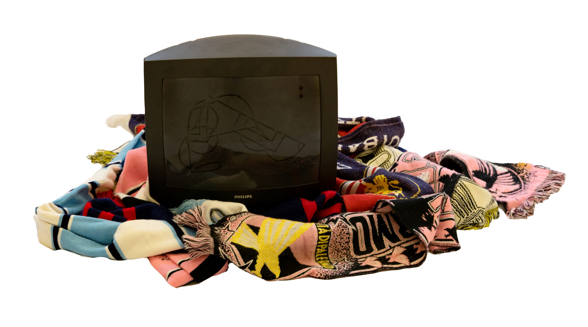 Installazione composta da un televisore con pellicola filmica adesiva ritagliata e sciarpe, esemplare unico