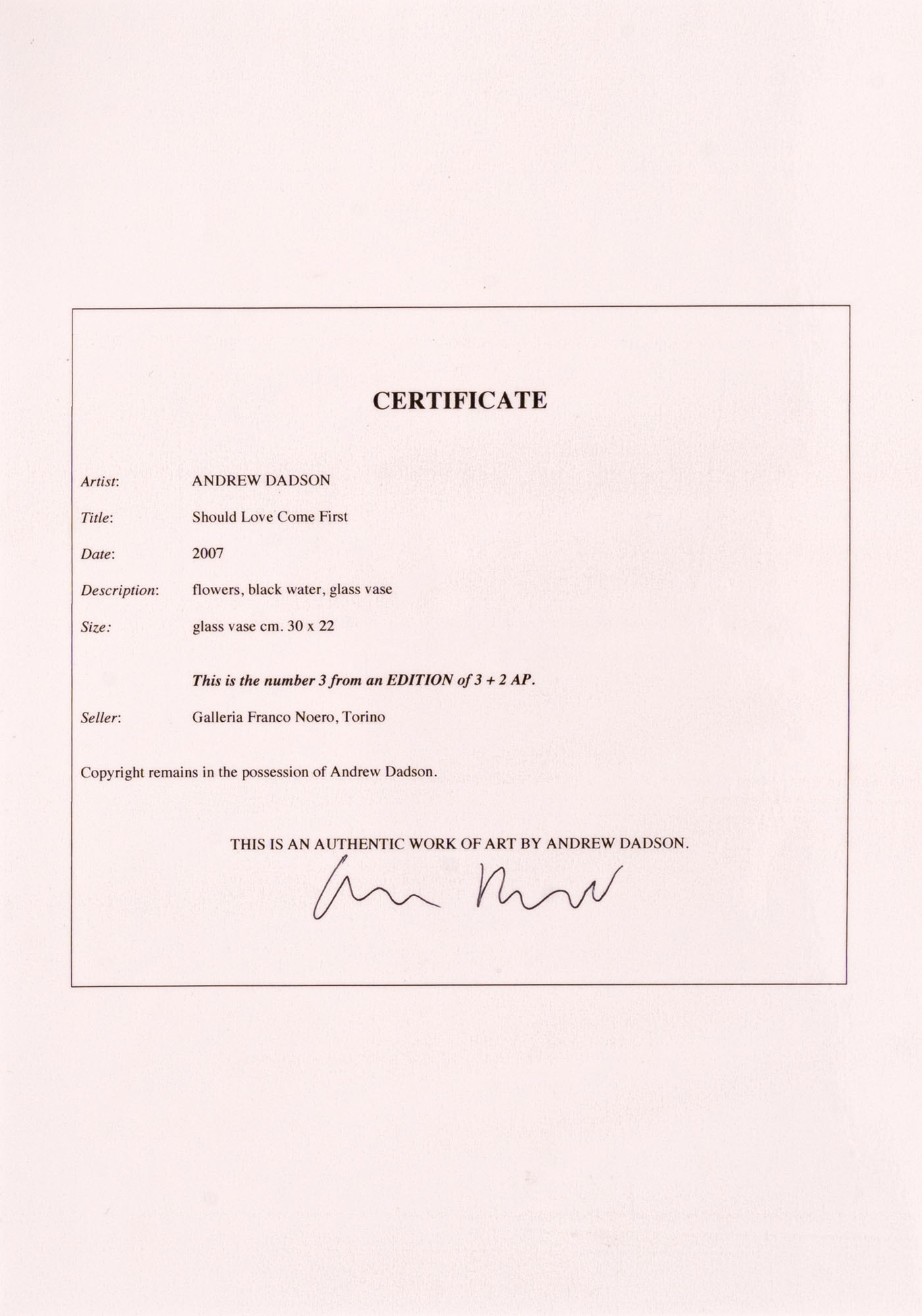 ANDREW DADSON(1980)Should Love Come First2007L'opera consiste nel certificato di autenticità firmato dall'artista che dà diritto a ricreare l'installazione composta da fiori, acqua nera e vaso di vetro, es. 3/3 + 2 APViene fornito il vaso di vetroDimensioni variabiliPROVENIENZA:Galleria Franco Noero, TorinoCollezione privata, TorinoESPOSIZIONI:28 giugno 2007 - 27 luglio 2007, Andrew Dadson, Galleria Franco Noero, Torino