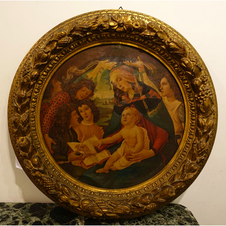Cornice rotonda in legno intagliato e dorato con all'interno oleografia raffigurante la Madonna con il Bambino