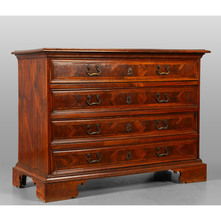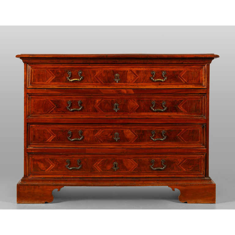 Canterano Luigi XIV in noce lastronato in legni vari sec.XVIII