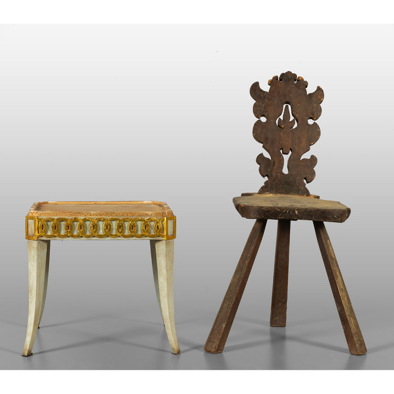 Sgabello Luigi XVI in legno laccato e dorato sec.XVIII e sgabello valdostano sec.XVI