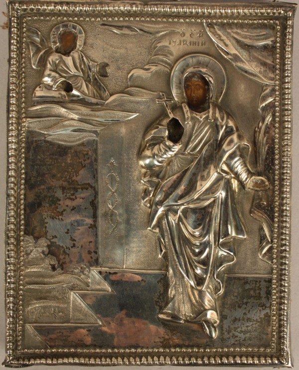 Icona con riza in argento sbalzato raff. ''CRISTO CON ANGELO''. Mosca. Inizi...