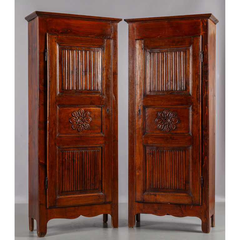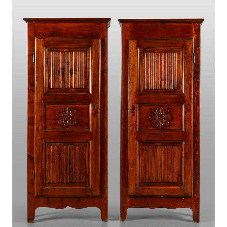 Coppia di piccoli armadi ad uno sportello composti con antiche porte piemontesi in noce intagliato