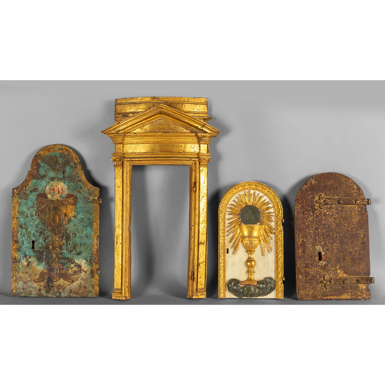 Due sportelli in ferro uno in legno intagliato e dorato ed una cornice a tabernacolo in legno intagliato e dorato del sec.XVIII