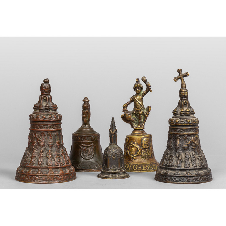 Precedente Lotto 0977 Successivo Aste Boetto - Via Mura dello Zerbino 10R, 16122 Genova ASTA DI ANTIQUARIATO Asta di Antiquariato giovedì 7 marzo 2024 ore 10:30 (UTC +01:00) OGGETTISTICA Cinque campanelli in bronzo di varie epoche e misure