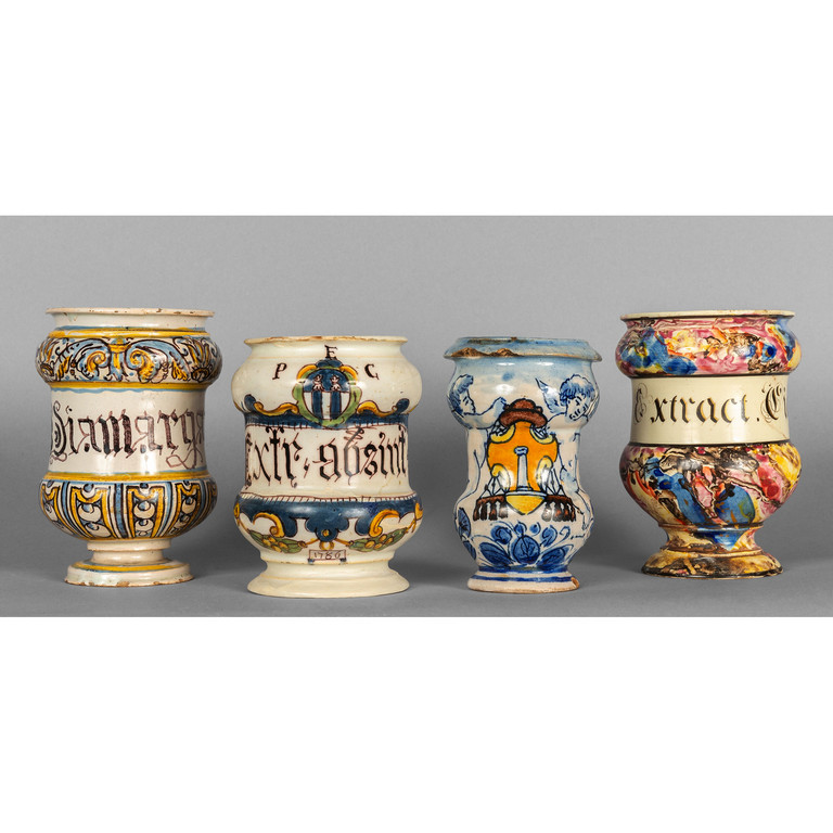 Tre piccoli albarelli di Faenza Centro Italia sec.XVIII e piccolo albarello di Savona sex.XIX