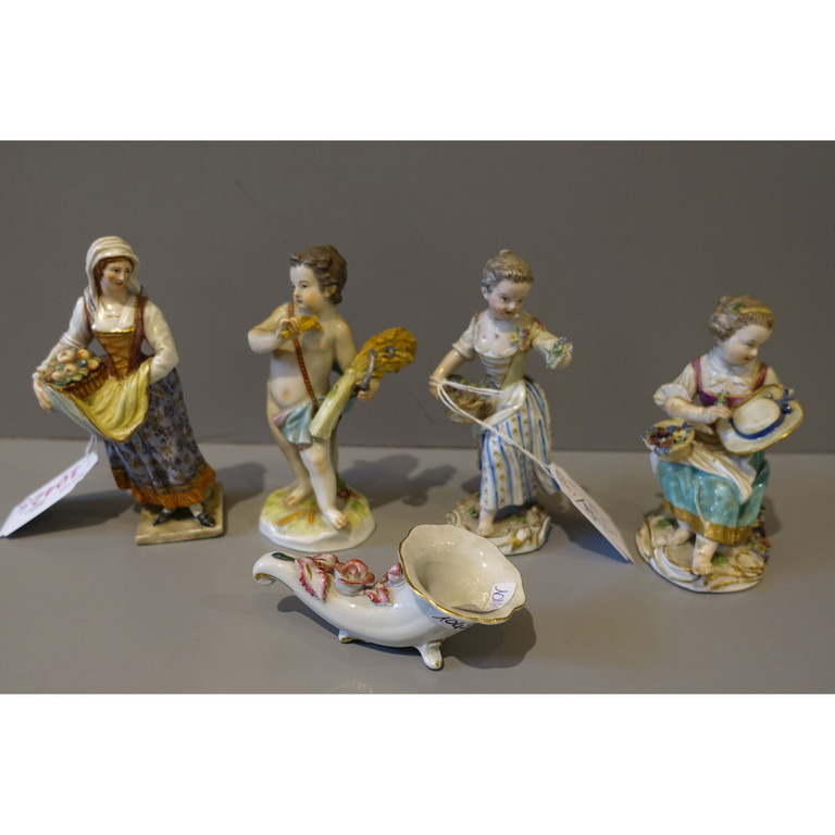 Precedente Lotto 1042 Successivo Aste Boetto - Via Mura dello Zerbino 10R, 16122 Genova ASTA DI ANTIQUARIATO Asta di Antiquariato giovedì 7 marzo 2024 ore 15:00 (UTC +01:00) OGGETTISTICA Quattro statuine di manifattura diverse in porcellana ed una cornucopia