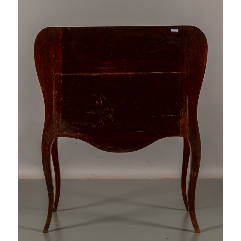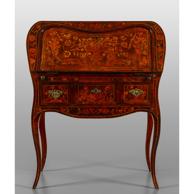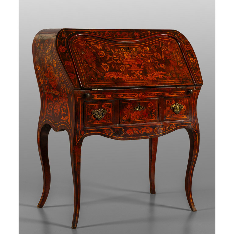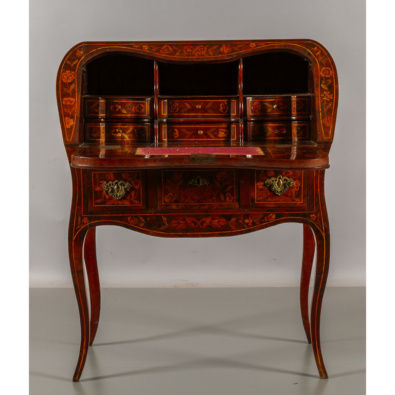 Piccola ribalta in stile Luigi XV movimentata sul fianco riccamente intarsiata a motivi floreali Olanda sec.XIX