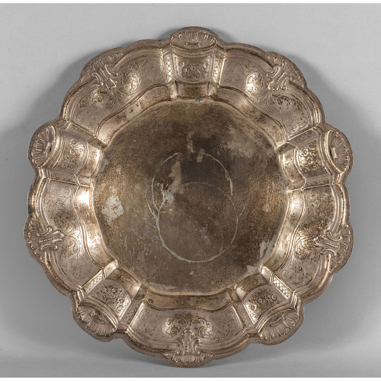 Precedente Lotto 1128 Successivo Aste Boetto - Via Mura dello Zerbino 10R, 16122 Genova ASTA DI ANTIQUARIATO Asta di Antiquariato giovedì 7 marzo 2024 ore 15:00 (UTC +01:00) OGGETTISTICA Grande piatto rotondo in argento con bordo sbalzatodiam.cm.39 gr.800