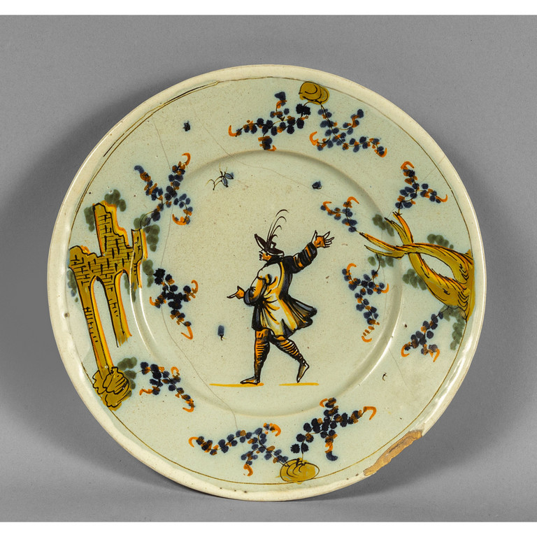 Alzata in maiolica con figurine nel paesaggio marca Mezzaluna Savona sec.XVIII