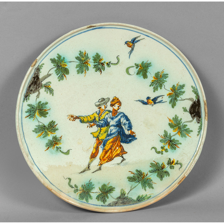 Alzata in maiolica decorata con figurine in policromia marca Stella Savona sec.XVIII