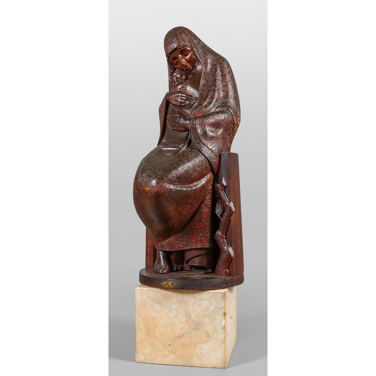 Mamma con bambino scultura in legno intagliato f.ta anni'30 del sec.XX base quadrata in marmo