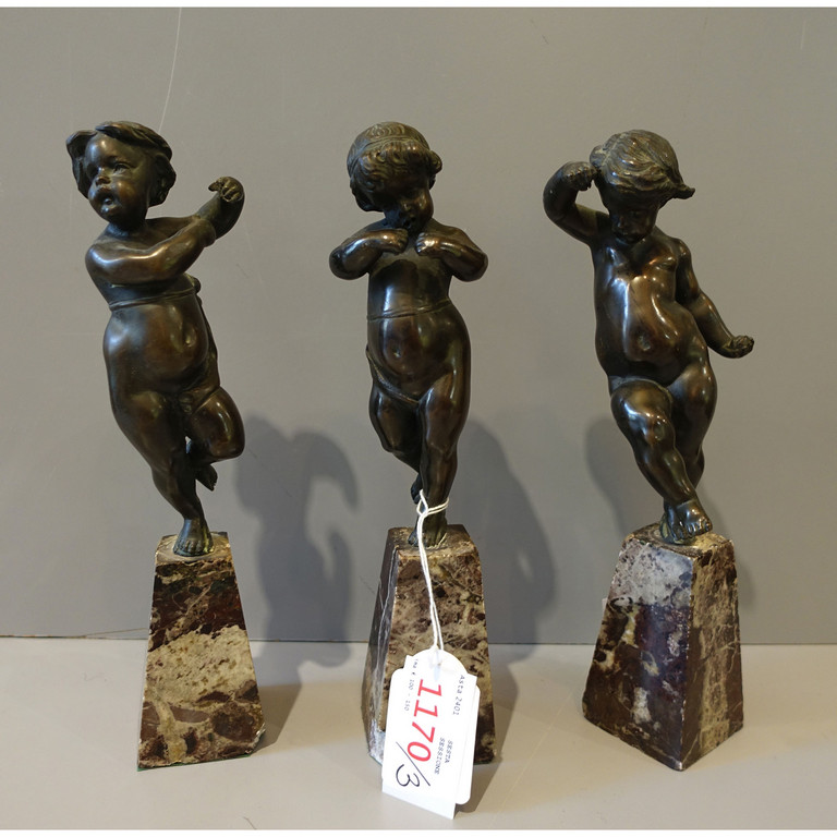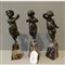 Tre putti danzanti in bronzo a patina scura poggianti su base in marmo