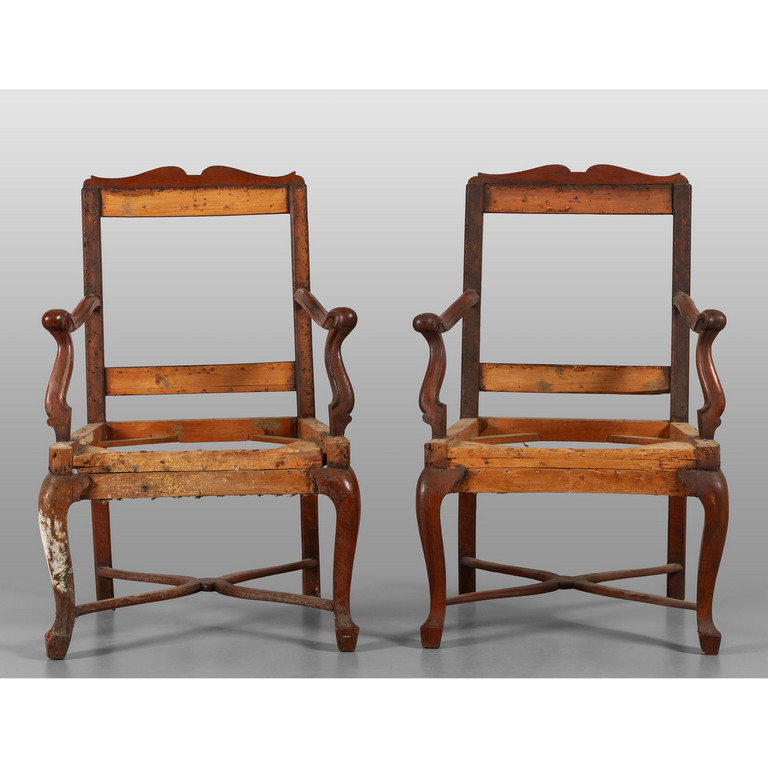 Coppia di poltrone Luigi XIV in noce gambe raccordate da traversa Toscana sec.XVI (senza imbottitura)