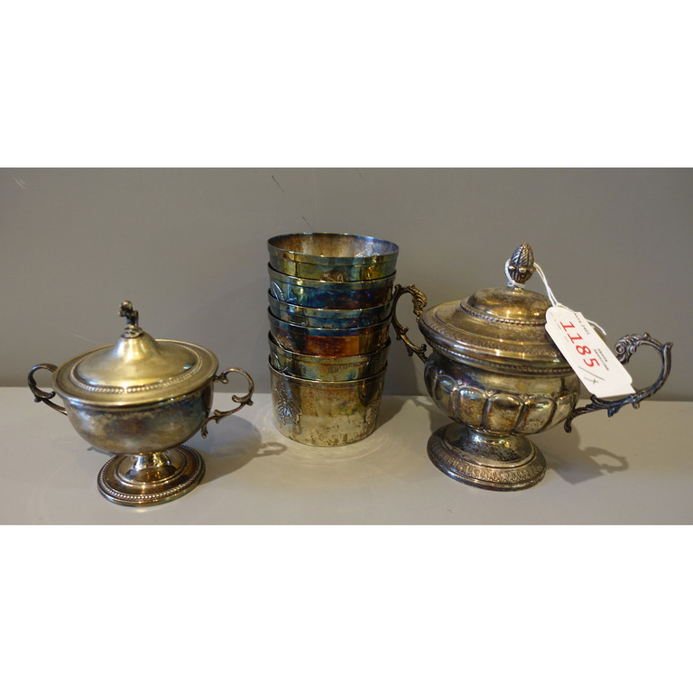 Sei coppette in argento decorate con frutta (gr.470) e due zuccheriere in argento (gr.450)