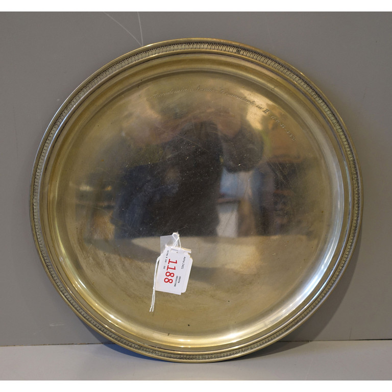Precedente Lotto 1188 Successivo Aste Boetto - Via Mura dello Zerbino 10R, 16122 Genova ASTA DI ANTIQUARIATO Asta di Antiquariato giovedì 7 marzo 2024 ore 15:00 (UTC +01:00) OGGETTISTICA Piatto in argento bordo decorato con palmettediam.cm.35 gr.700