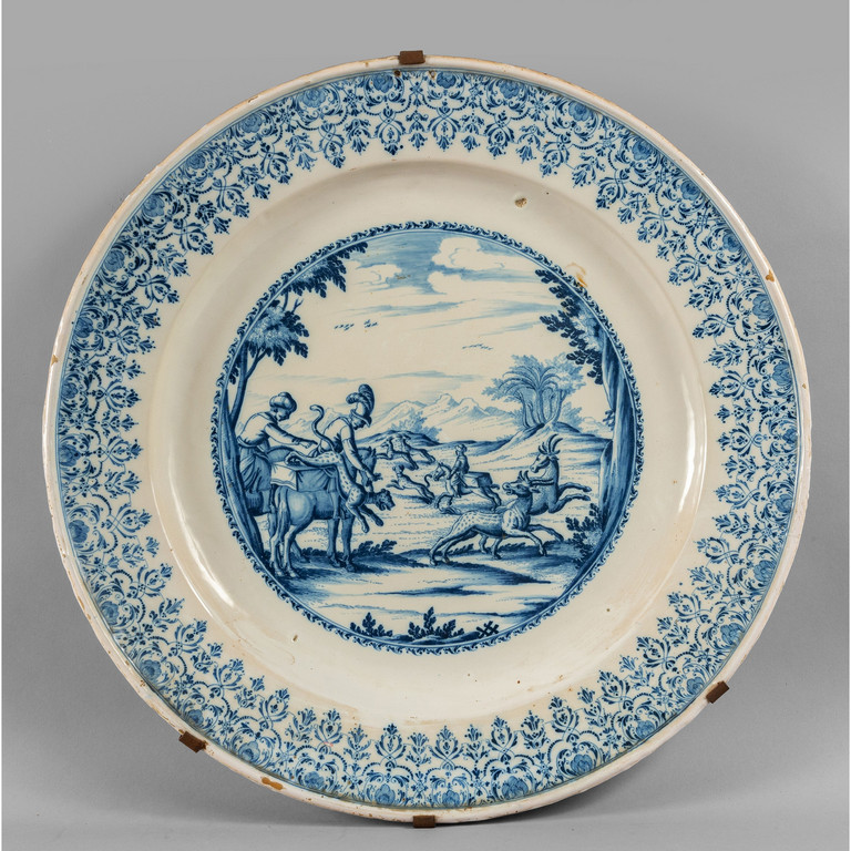 Piatto in maiolica decorato con scena di caccia al cervo Piemonte sec.XVIII