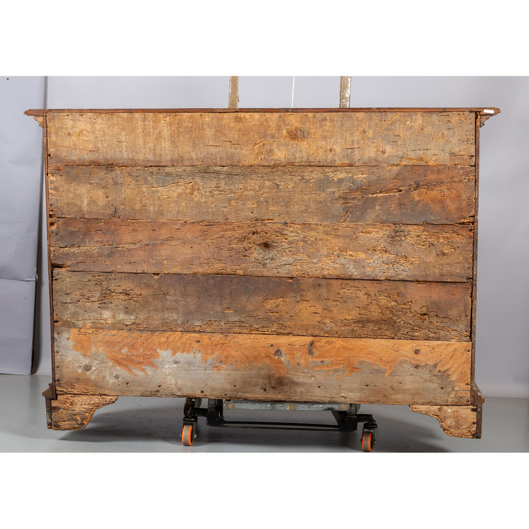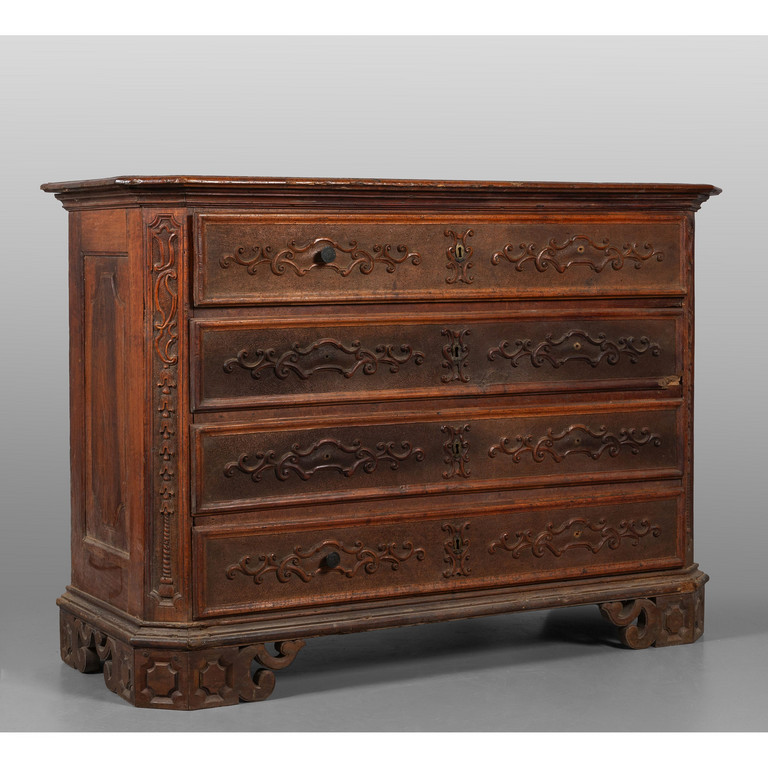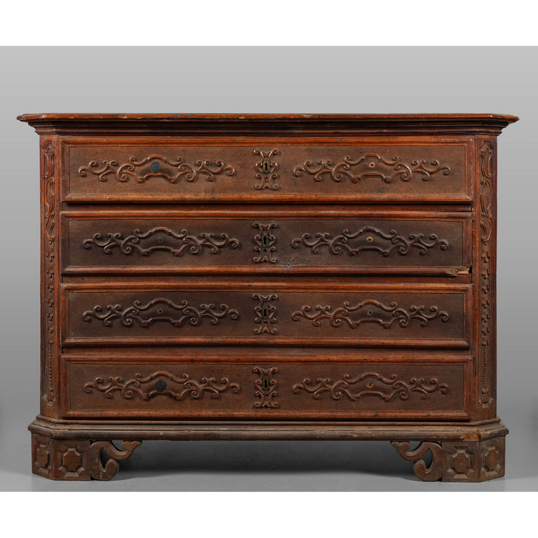 Comò Luigi XIV in noce a quattro cassetti intagliati montanti scanalati Piemonte inizi sec.XVIII