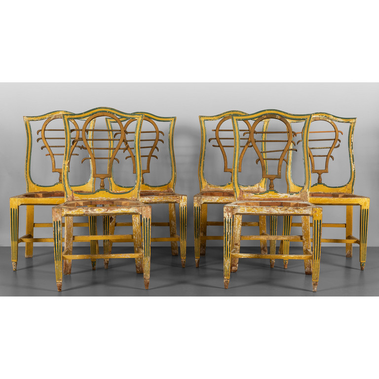 Sei sedie Direttorio in legno laccato giallo e azzurro schienale a lira Toscana I metà sec.XIX (mancanti di seduta)