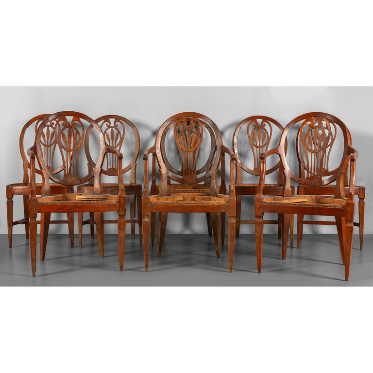 Quattro poltrone e quattro sedie in ciliegio schienale a mongolfiera Toscana I metà sec.XIX (mancanti della seduta)