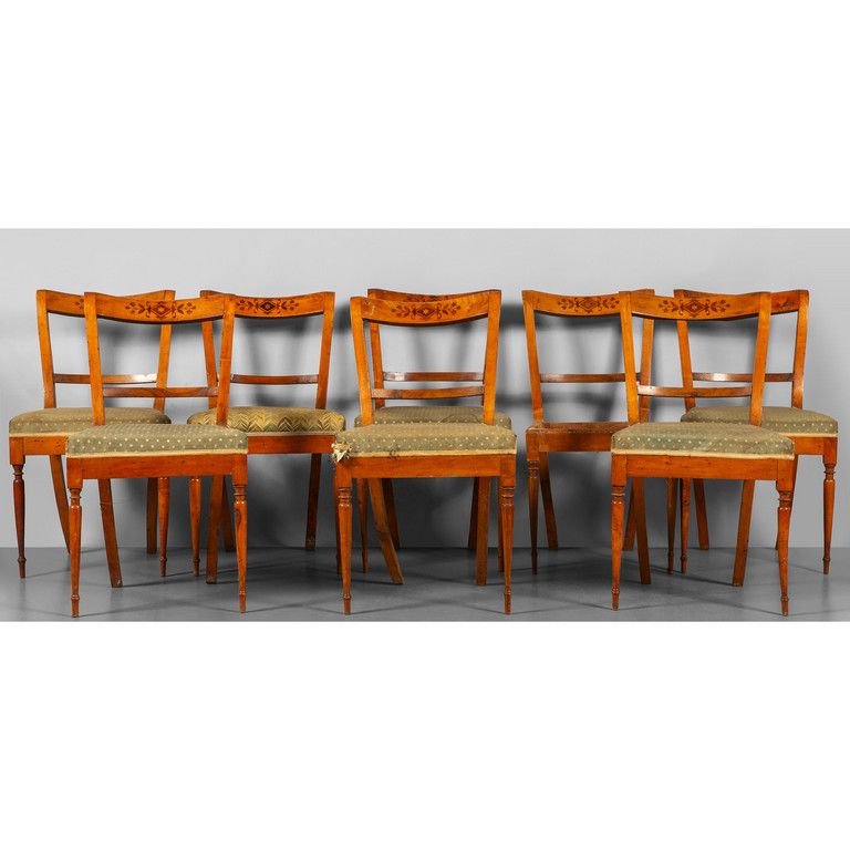 Otto sedie Carlo X in ciliegio con schienale intarsiato con motivi floreali Toscana I metà sec.XIX (una priva di imbottitutra)