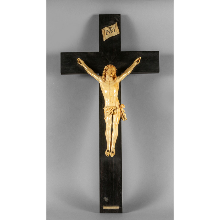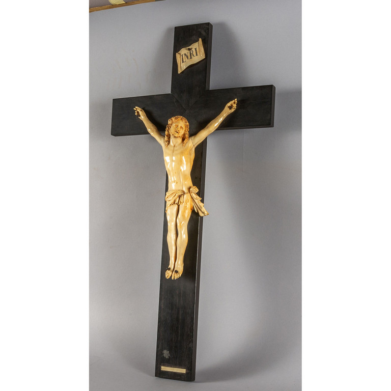 Cristo Crocefisso scultura in avorio poggiante su Croce in legno ebanizzato sec.XVII