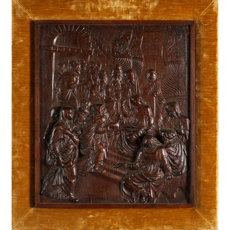 Gesù tra i dottori pannello a bassorilievo in legno scolpito Francia sec.XVII