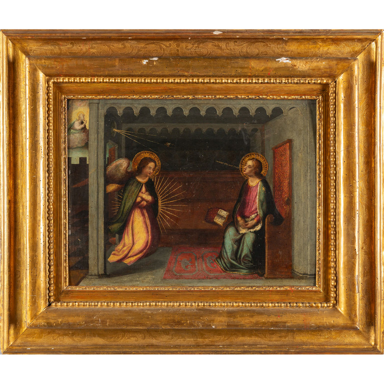 Scuola toscana sec.XVII 'Annunciazione' olio su tavola cornice coeva in legno dorato
