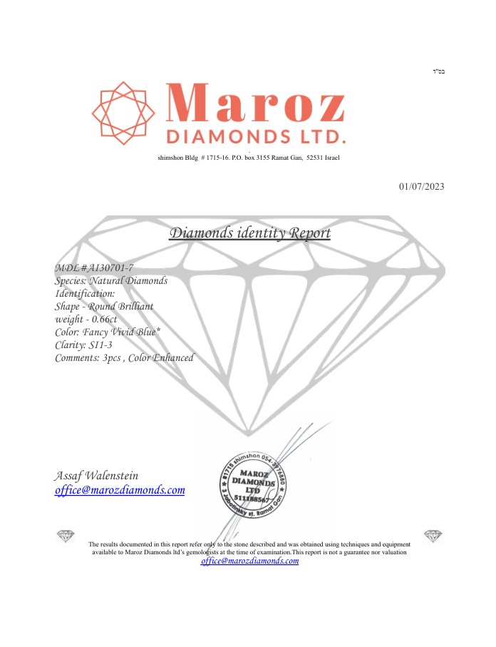3 DIAMANTI COLORE ESALTATO 0,66 CARATI COLORE FANCY BLU VIVIDO* - PUREZZA SI1-3 - TAGLIO BRILLANTE - CERTIFICATO GEMMOLOGICO MAROZ DIAMONDS LTD MEMBRO ISRAEL DIAMOND EXCHANGE - AI30701-7