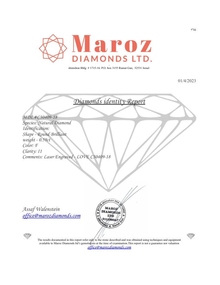 DIAMANTE NATURAL POLISHED 0,59 CARATI COLORE F - PUREZZA I1 - TAGLIO BRILLANTE - PUREZZA INCISO AL LASER - CERTIFICATO GEMMOLOGICO MAROZ DIAMONDS LTD MEMBRO ISRAEL DIAMOND EXCHANGE - C30409-18-LC