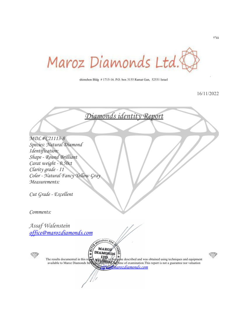 DIAMANTE NATURAL POLISHED 0,5 CARATI COLORE FANCY GIALLO GRIGIO - PUREZZA I1 - TAGLIO BRILLANTE - CERTIFICATO GEMMOLOGICO MAROZ DIAMONDS LTD MEMBRO ISRAEL DIAMOND EXCHANGE - C21113-8