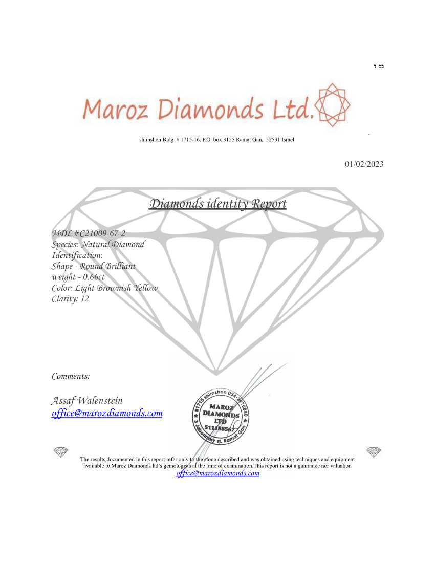 DIAMANTE 0,66 CARATI CHIARO MARRONCINO GIALLO PUREZZA I2 - TAGLIO BRILLANTE - CERTIFICATO GEMMOLOGICO MAROZ DIAMONDS LTD MEMBRO ISRAEL DIAMOND EXCHANGE - C21009-67-2