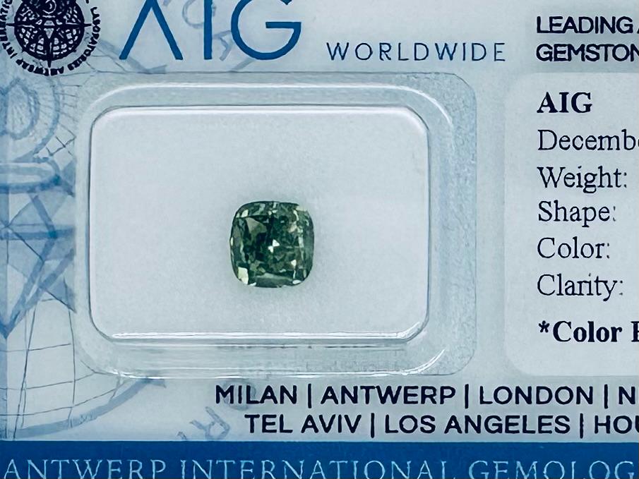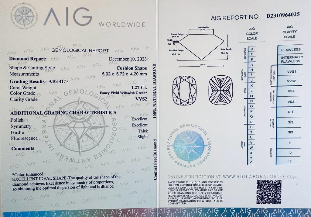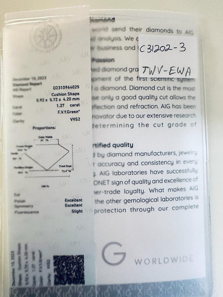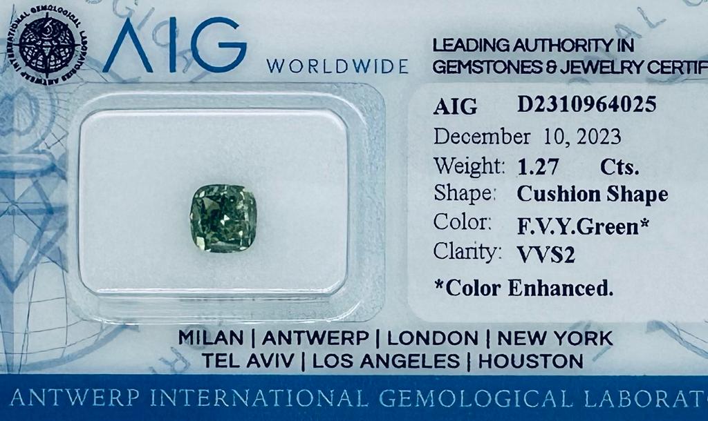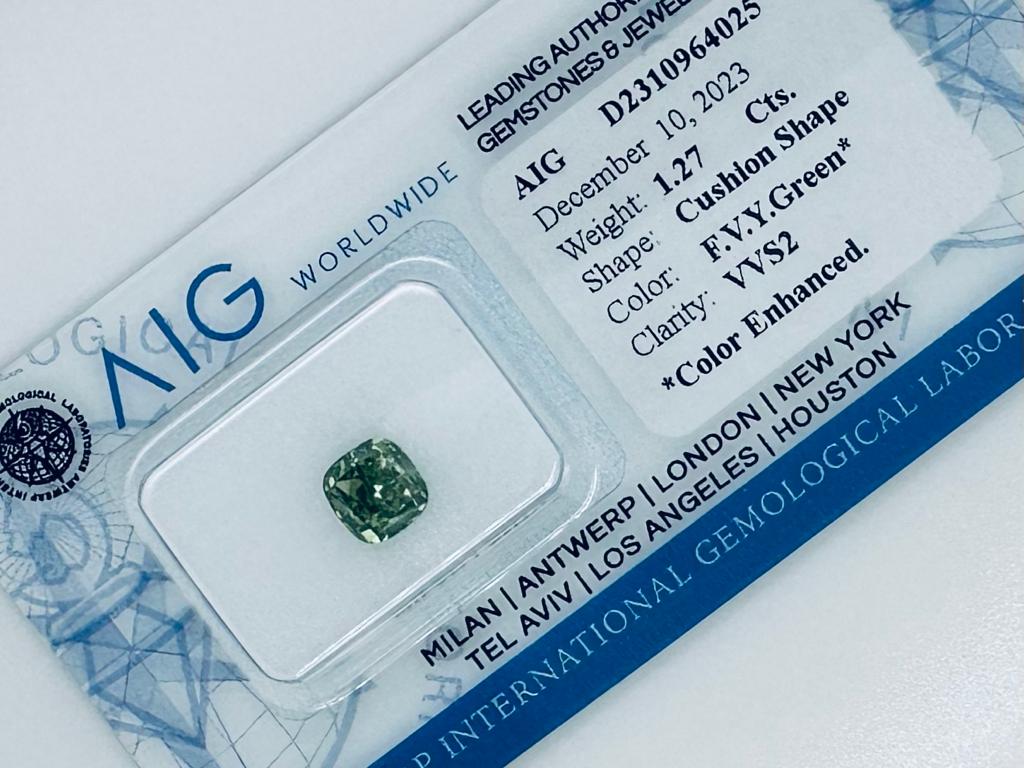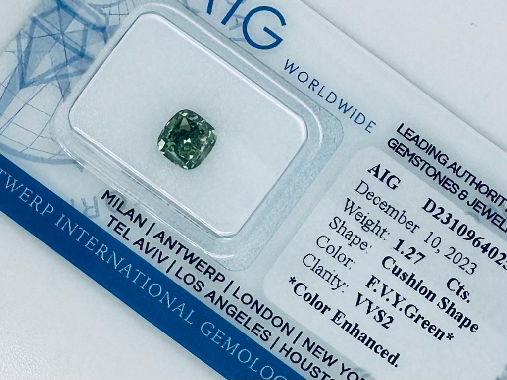 DIAMANTE COLORE ESALTATO 1,27 CARATI COLORE FANCY VERDE* GIALLOGNOLO VIVIDO- PUREZZA VVS2 - TAGLIO CUSCINO - CERTIFICATO AIG - C31202-3
