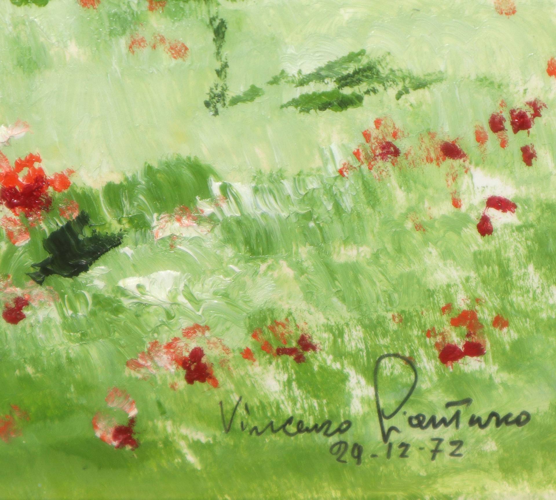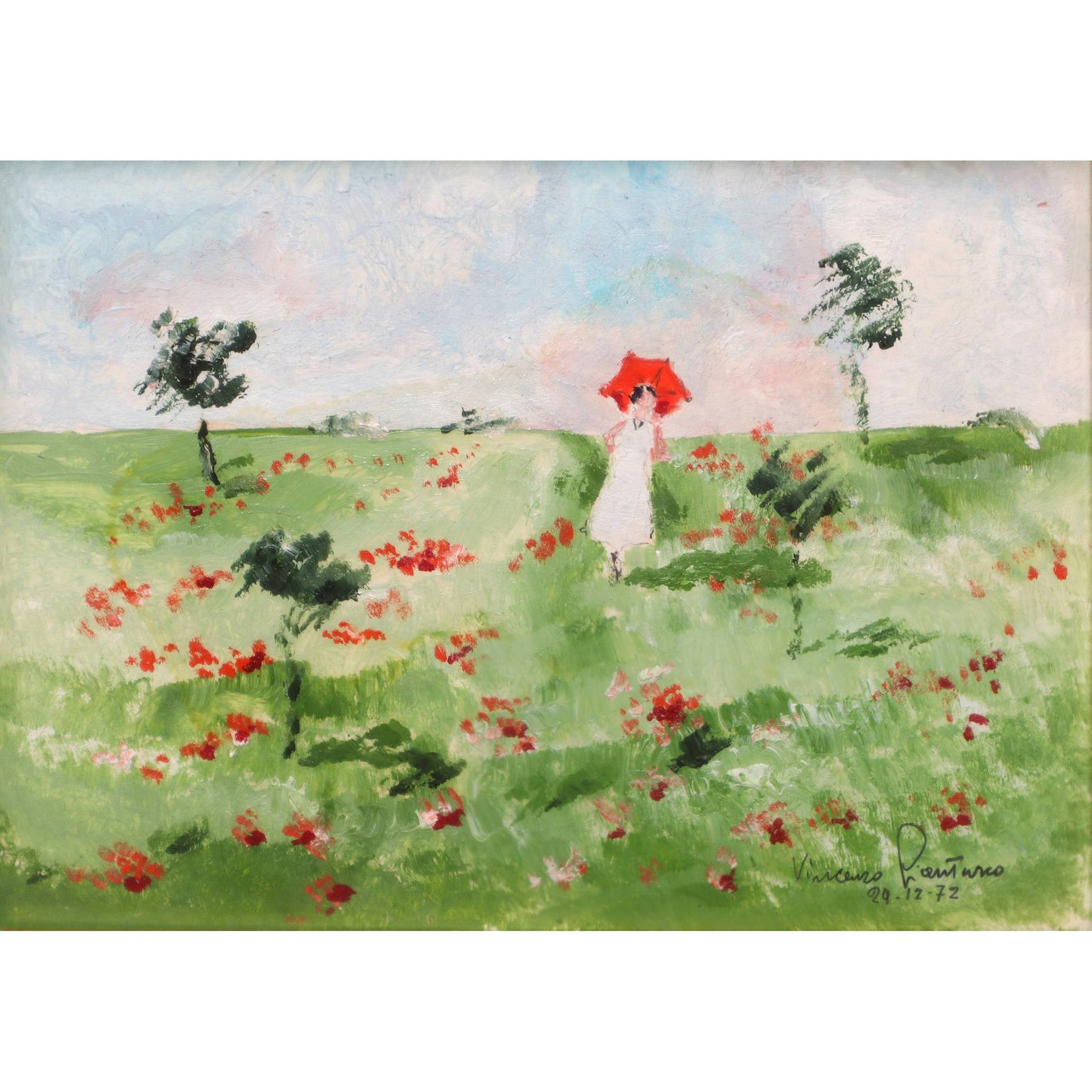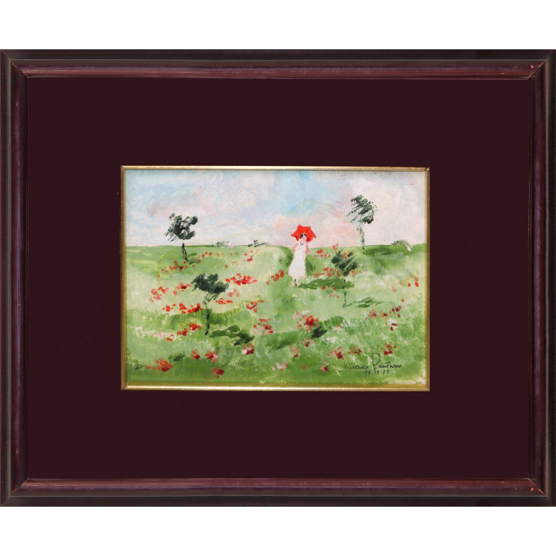 Donna con ombrello in un campo di papaveri cm 17,5x24,5 in cornice cm 36x42 Firmato in basso a destar e datato 29.12.72Firmato in basso a destar e datato 29.12.72