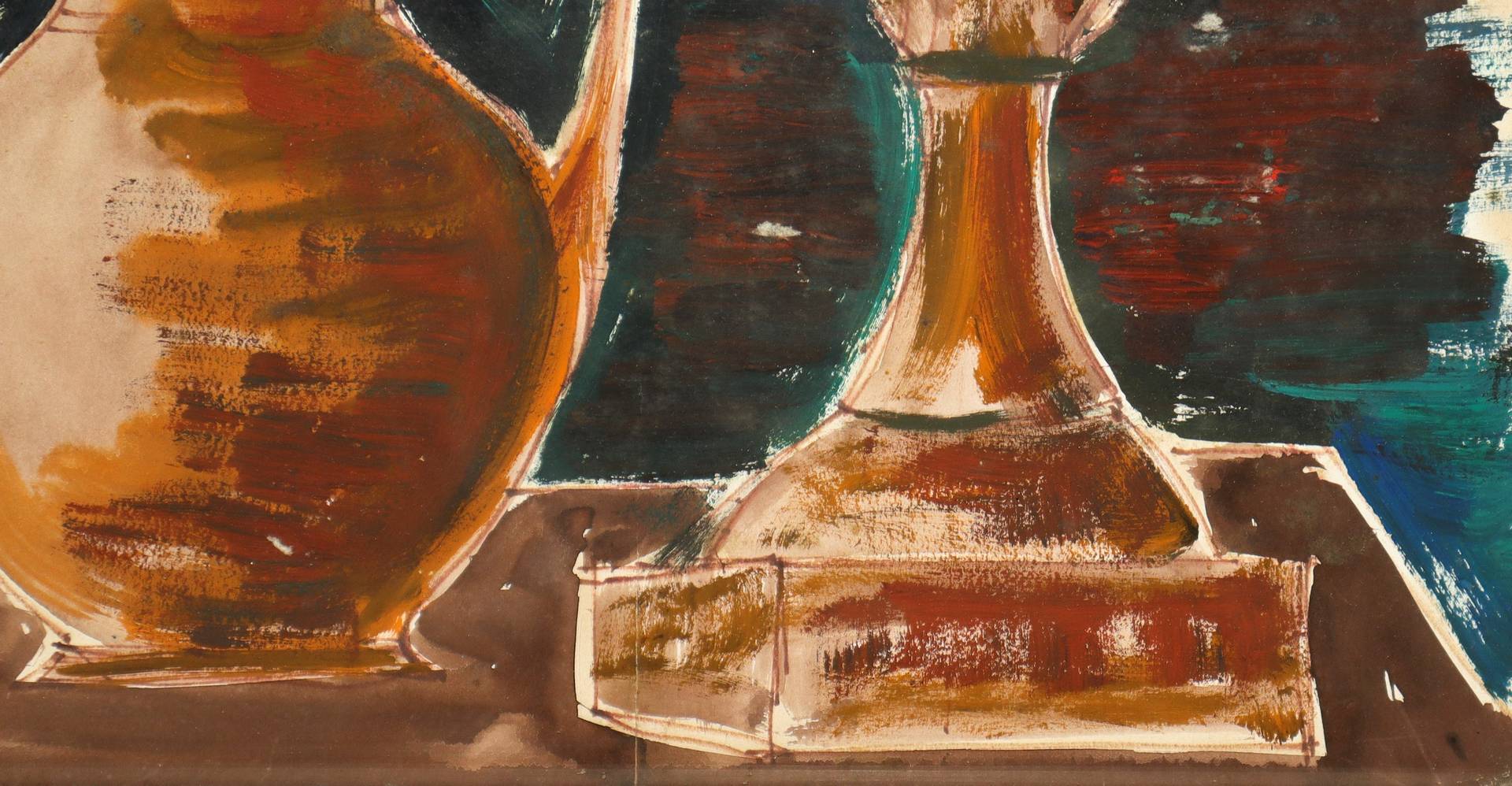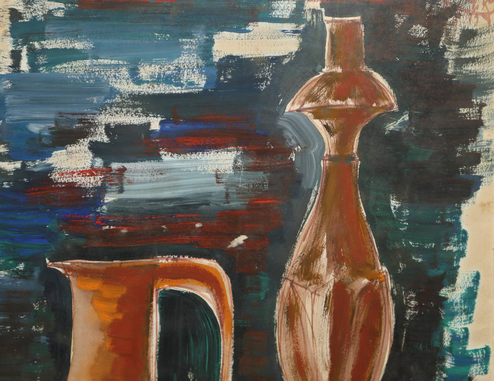Natura morta con boccale e candeliere, 1979 H cm 44x34 - in cornice H cm 59x49 Tecnica mista su cartoncino Firmato in alto a destra e datato