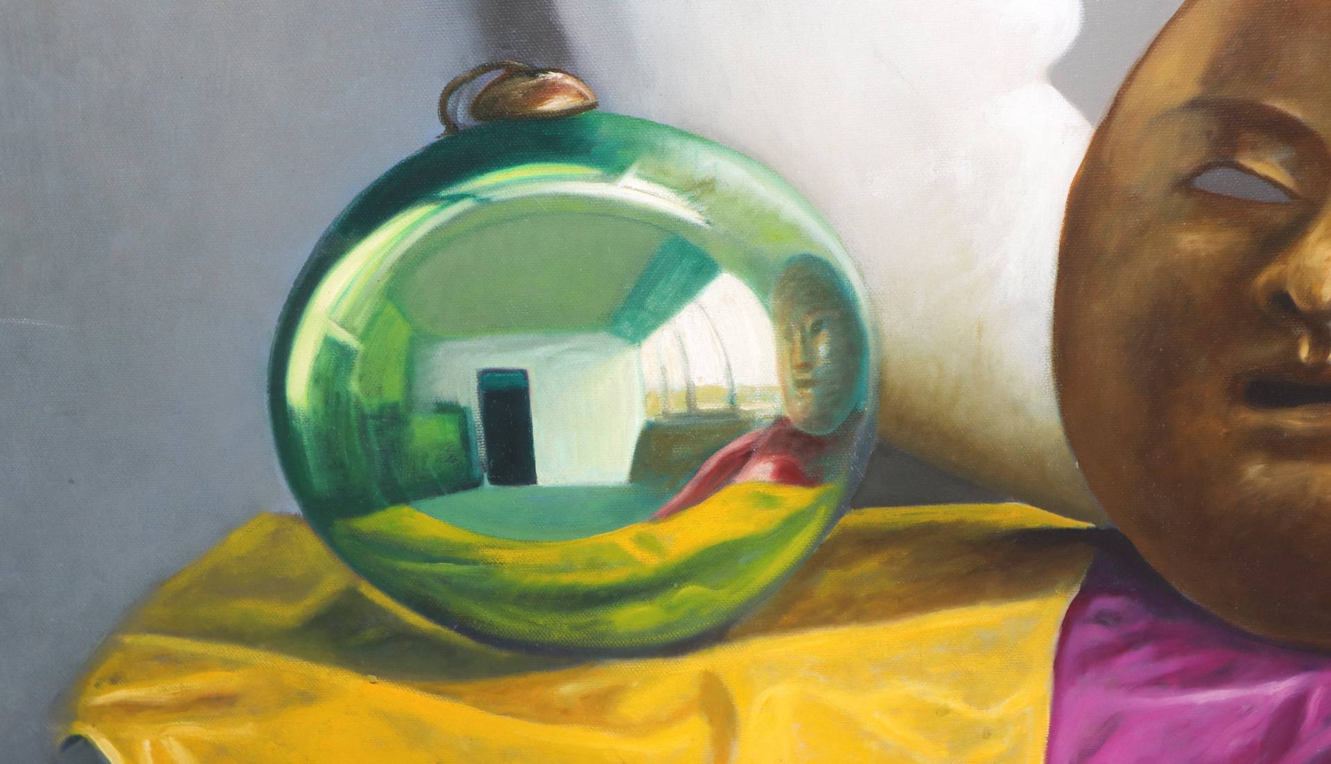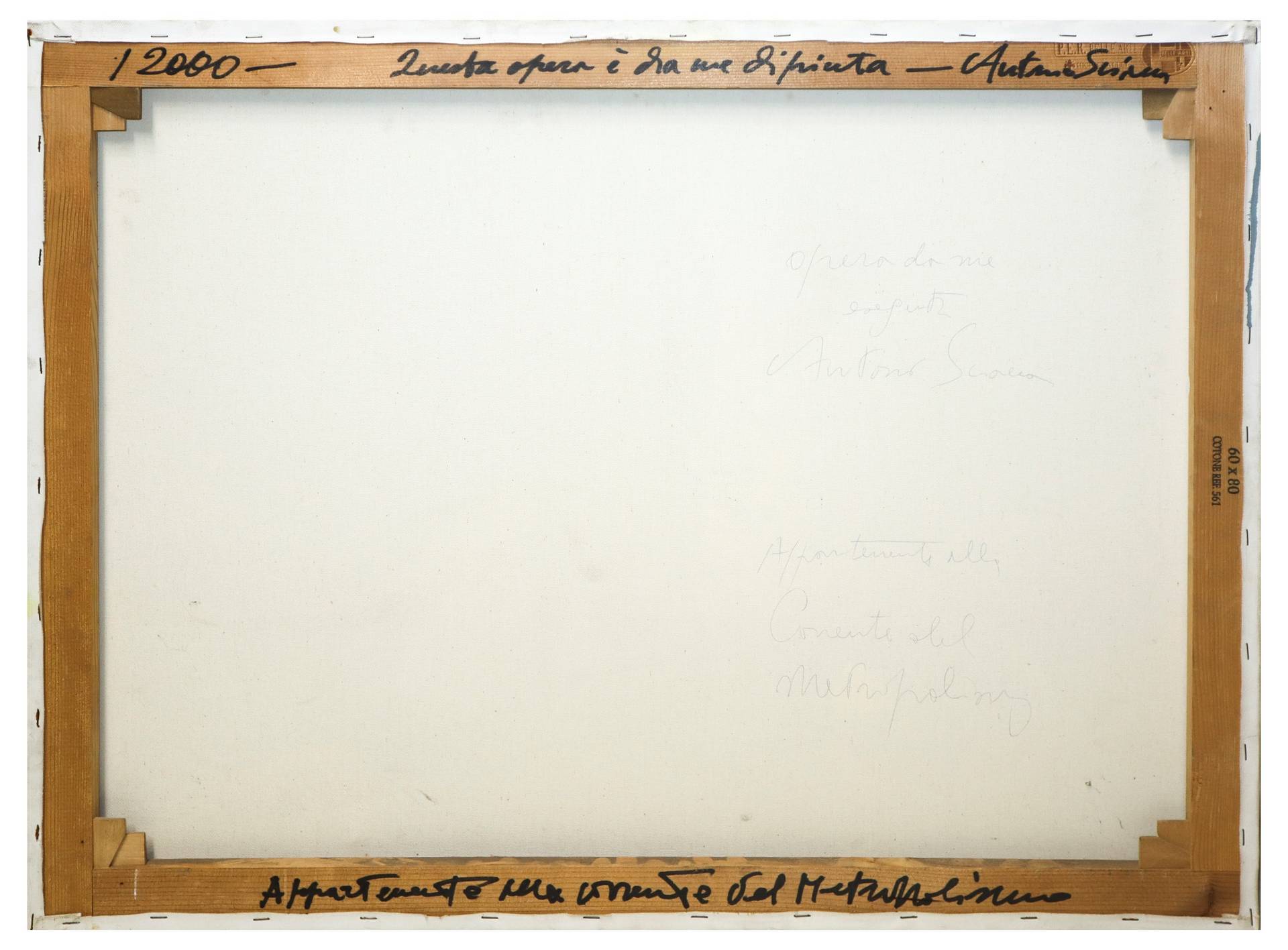 Antonio Sciacca (Catania 1957) - Luna bianca con sfere cm 60x80 Olio su tela Firmato in basso a destra e sul retro. Sul retro scritta ''appartenente alla corrente del Metropolismo''