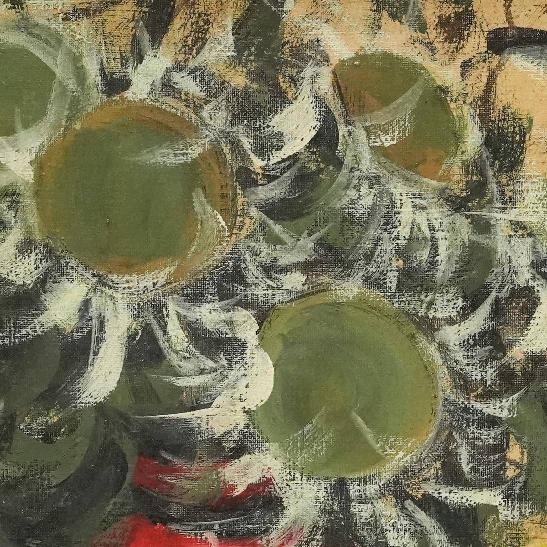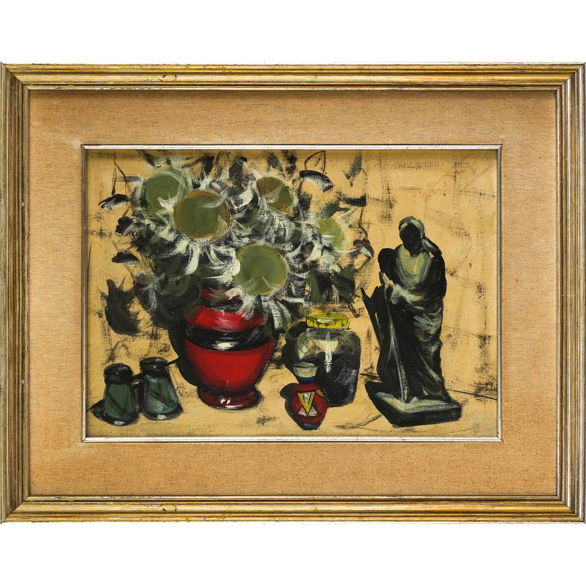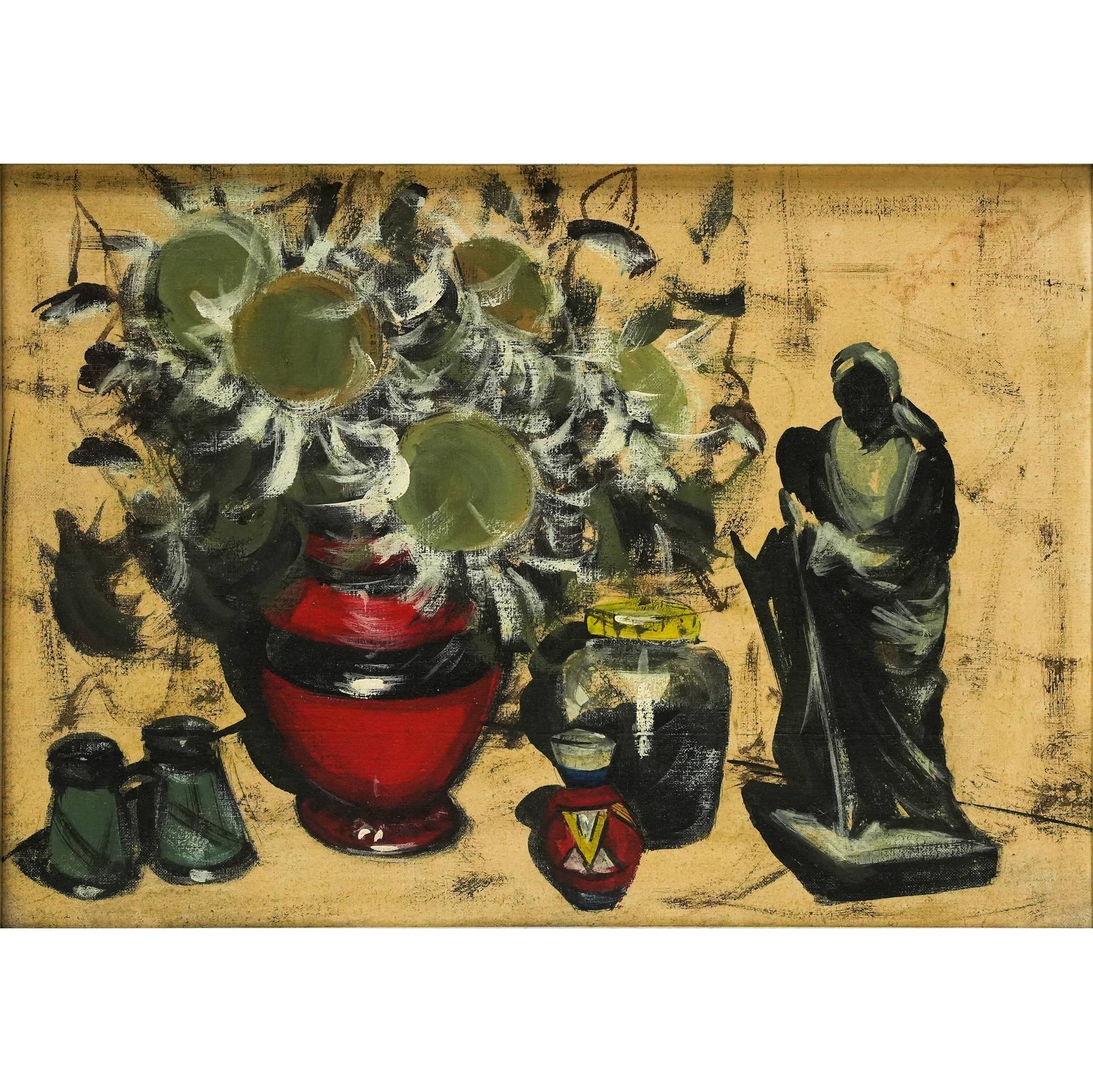 Composizione con vaso di girasoli, statuetta e vasetti H cm 25x35 - in cornice H cm 38x48 Olio su tela Titolo e firma al retro