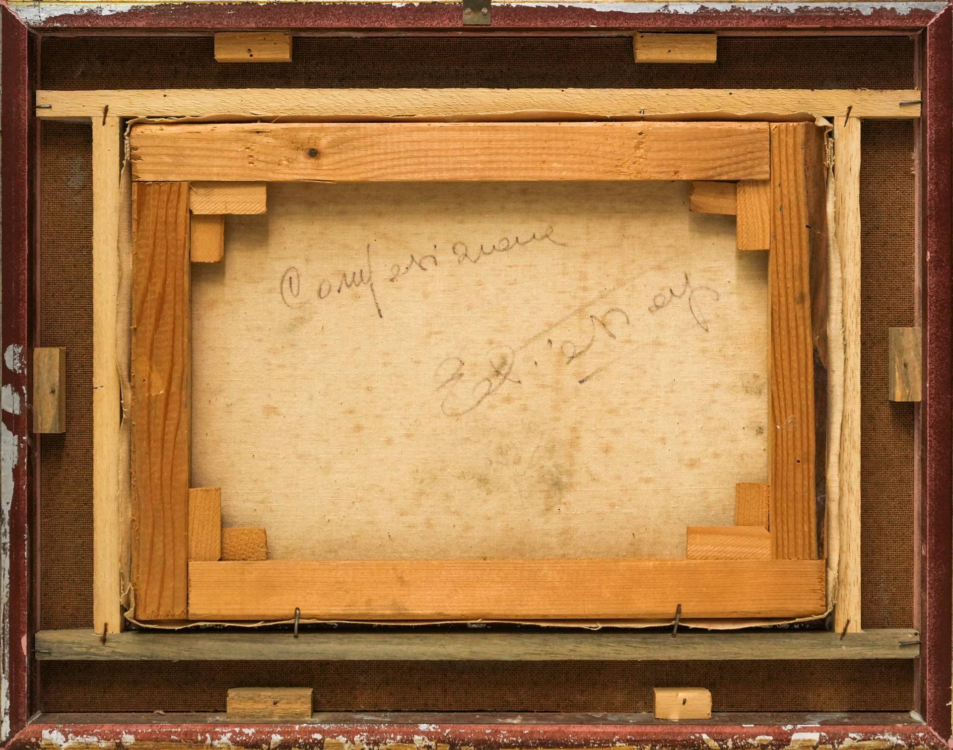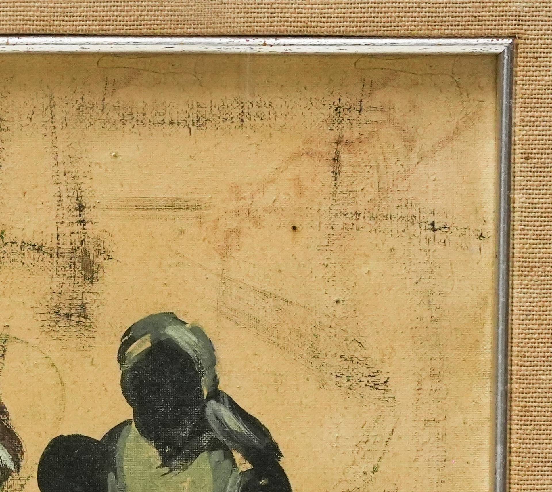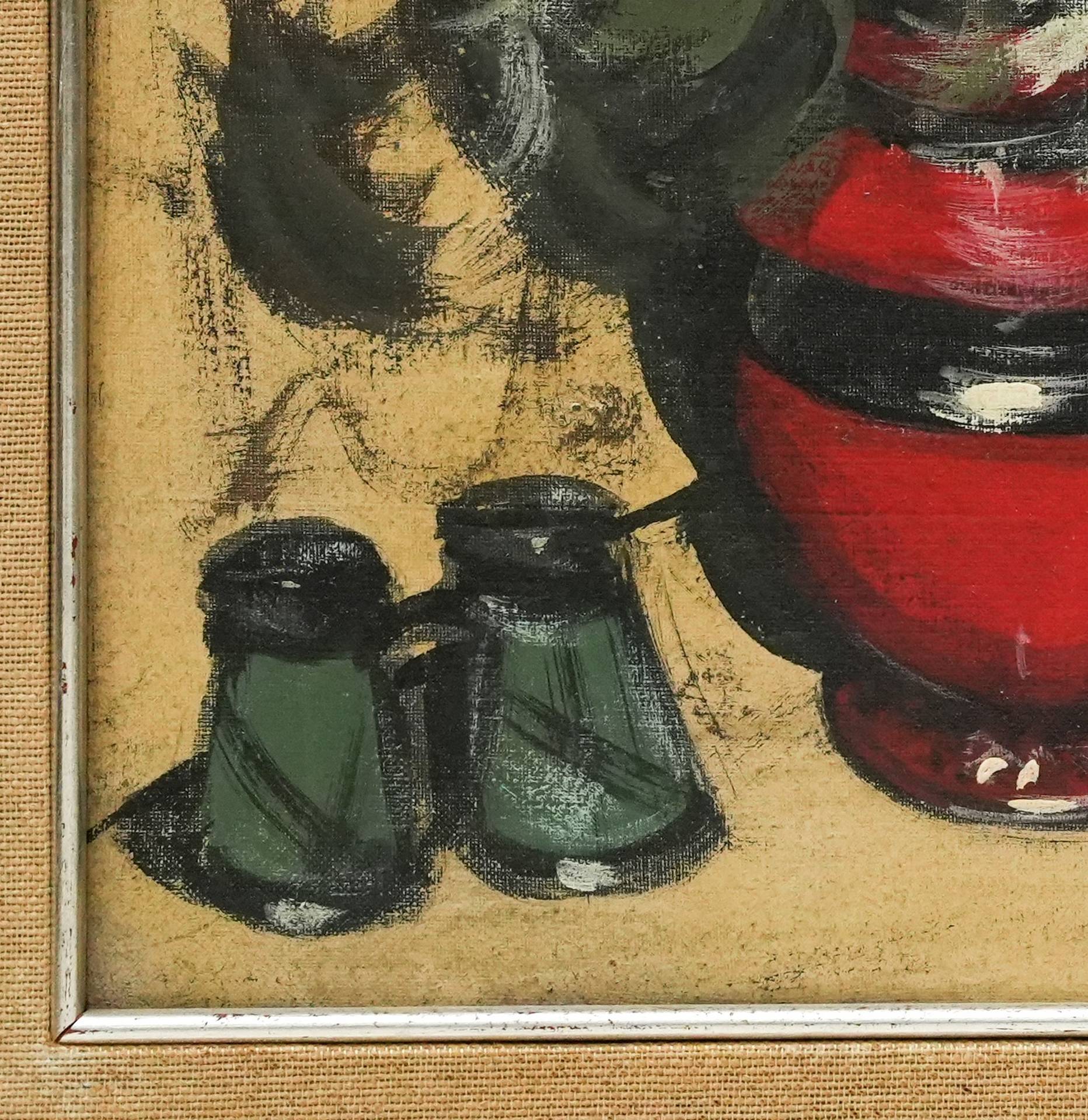 Composizione con vaso di girasoli, statuetta e vasetti H cm 25x35 - in cornice H cm 38x48 Olio su tela Titolo e firma al retro