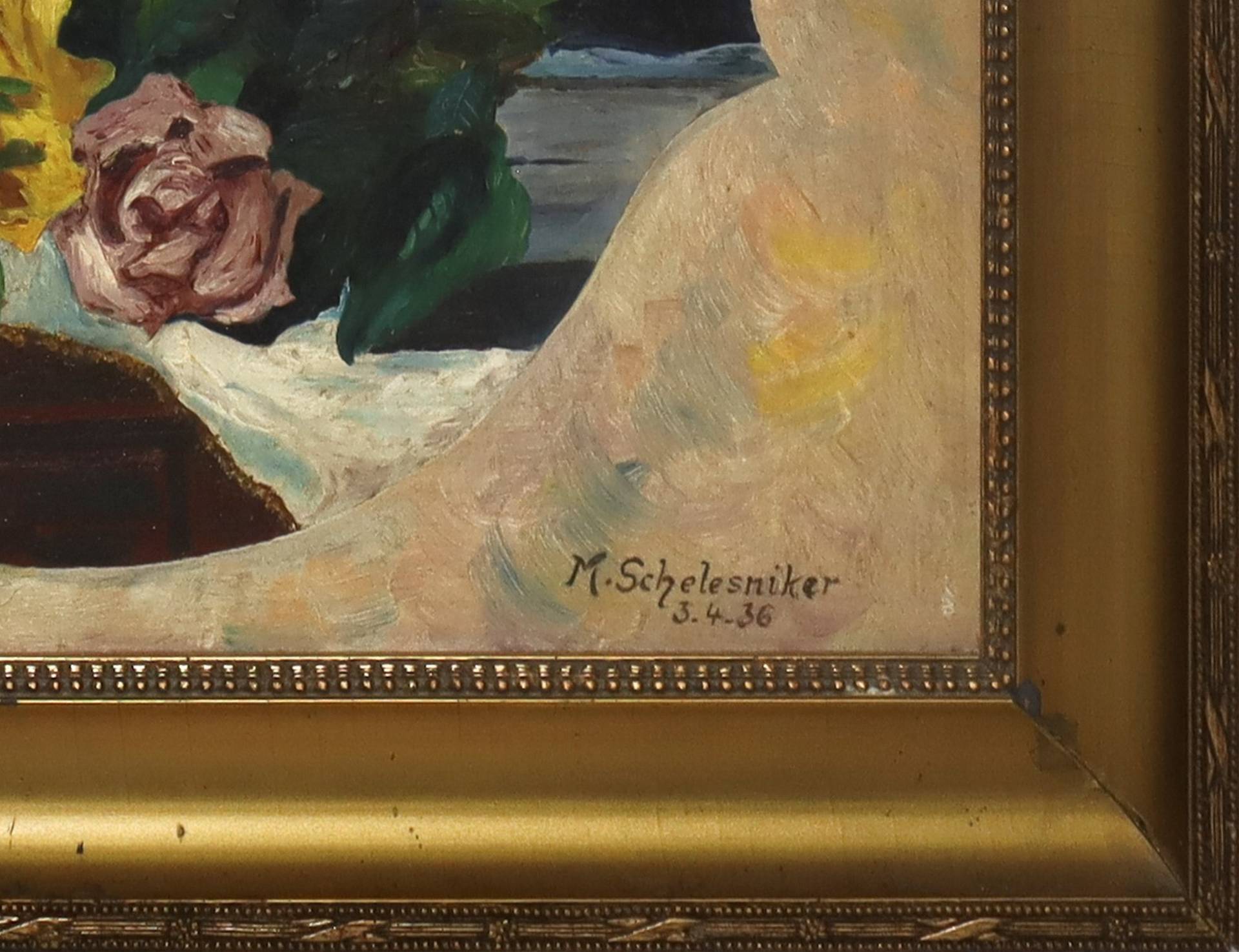 Vaso con rose cm 50,5 x cm 42; in cornice cm 59 x cm 50 olio su cartoncino Firmato M.Schelesniker e datato 3-4-36
