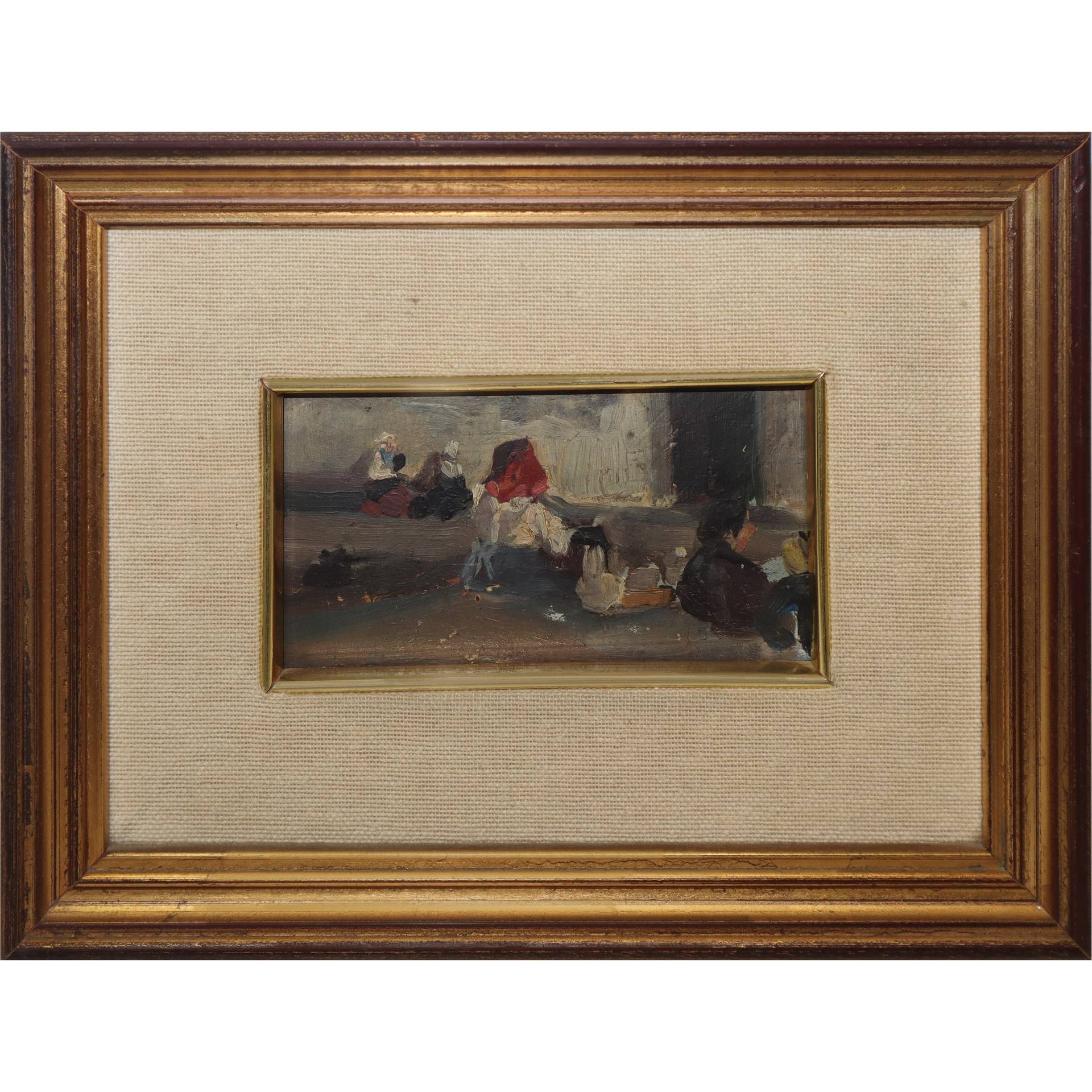 Vincenzo Marano (Acicastello 1938-2016) - Tavoletta raffigurante donne sedute a lavoro H cm 6.2 x 12.3 Olio su tavoletta Firmato sul retro a matita V.Marano
