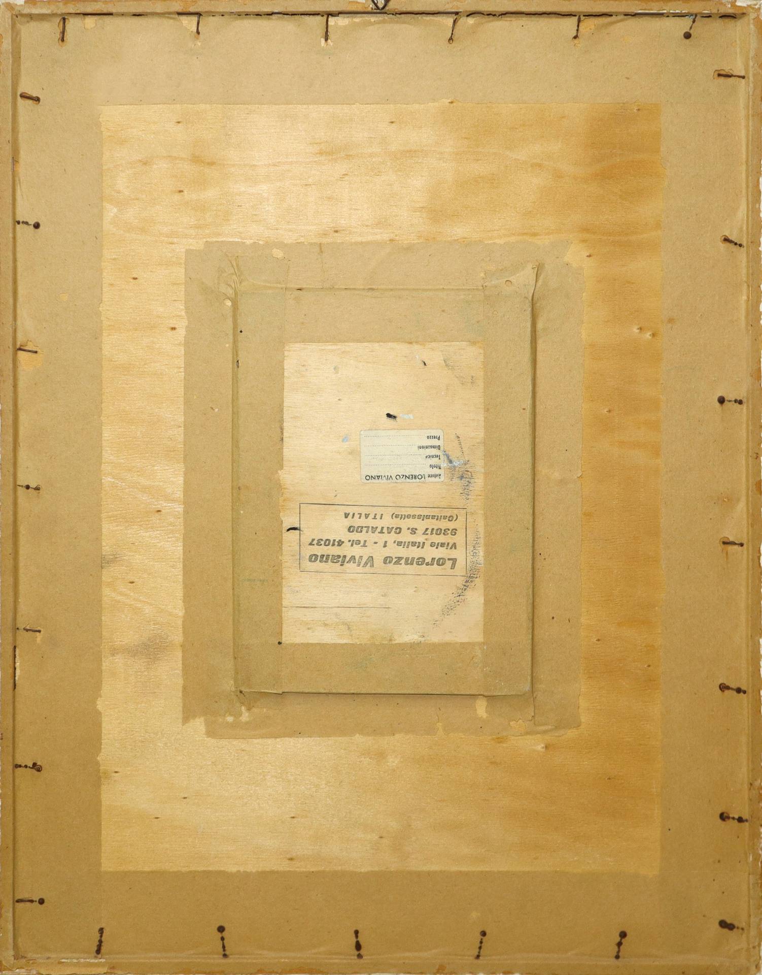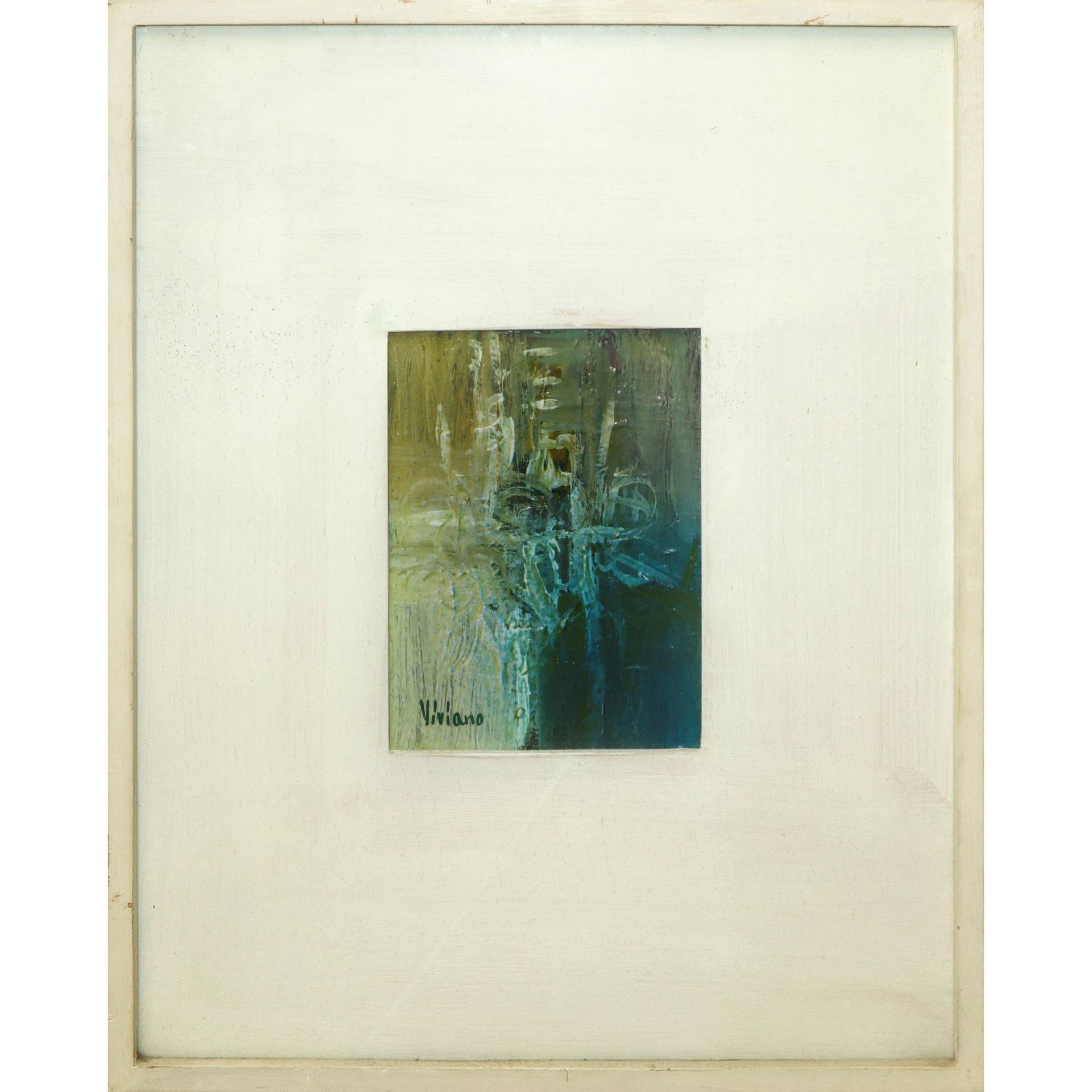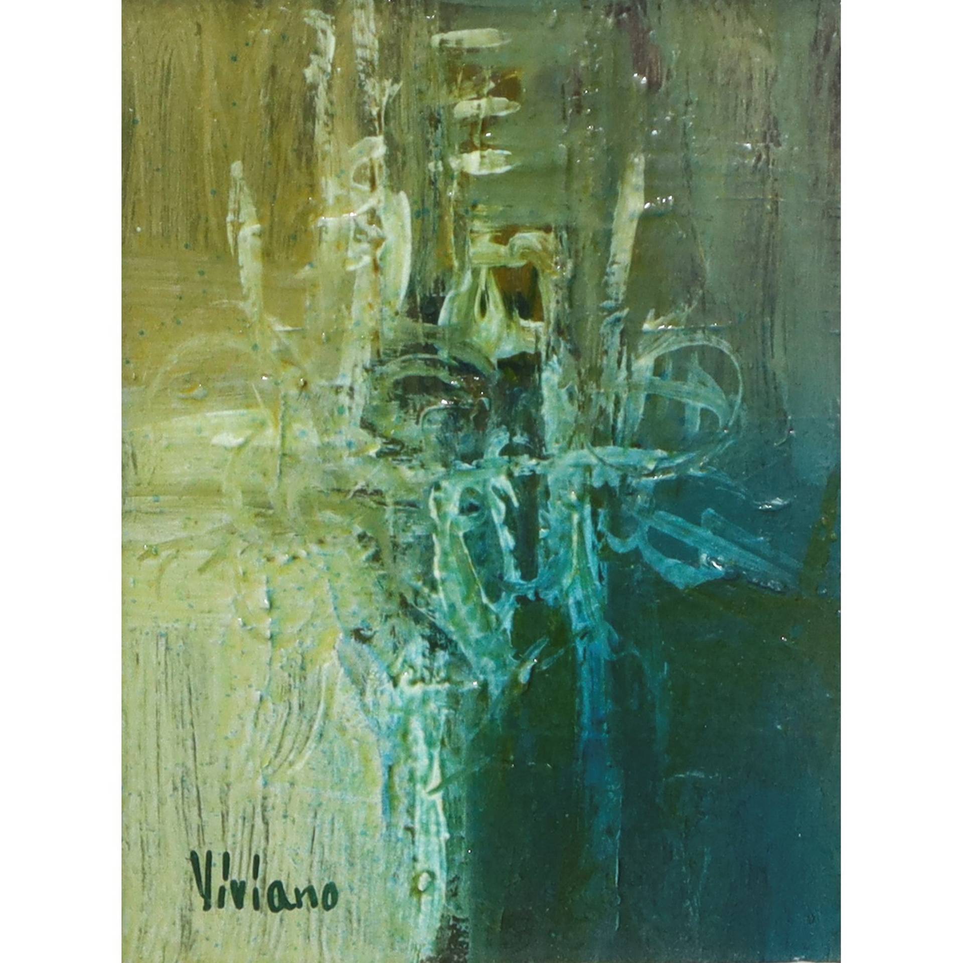 Lorenzo Viviano (San Cataldo 1932) - Composizione astratta H cm 19 x 14 - in cornice H cm 46 x 47 olio su tavola Firmato in basso a sinistra. Al retro timbro con dati e contatti dell'autore.